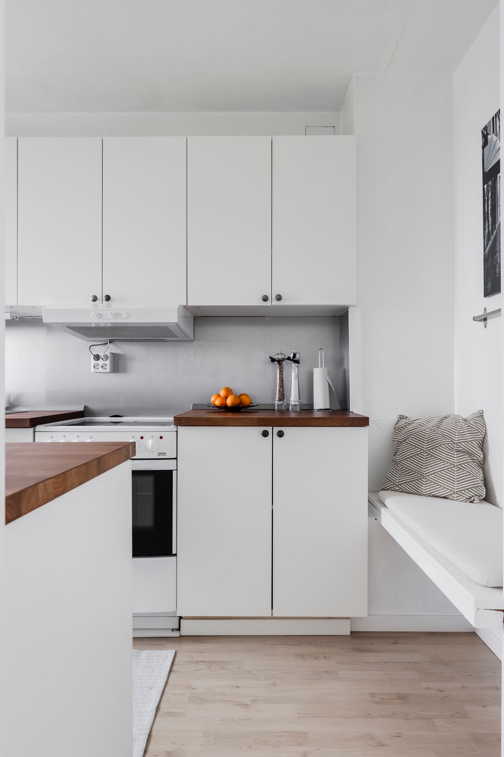 Köket är nyligen renoverat med bra arbetsytor, gott om förvaring och en mysig sitthörna. Lägenheten har genomgående fräscha ytskikt och fina golv. Ett källarförråd hör till bostaden och i källaren hittas även tvättstuga.
