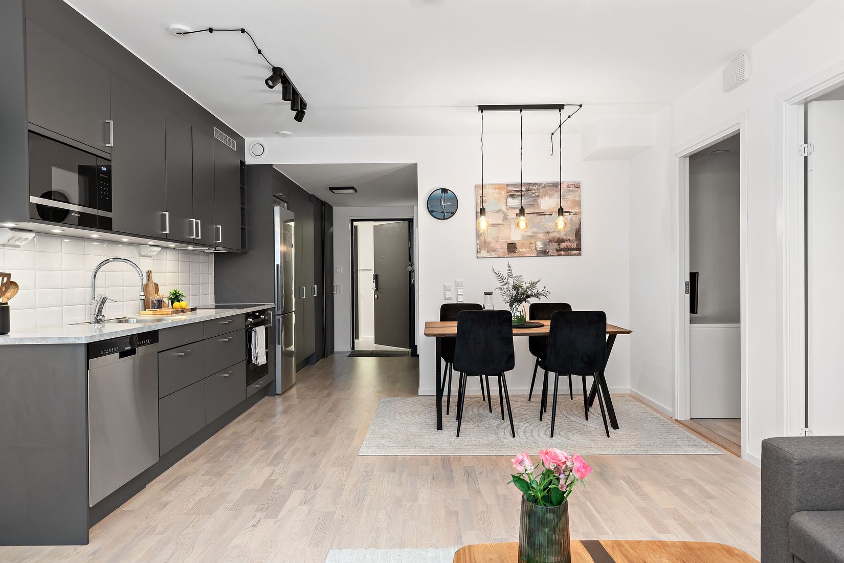 Den öppna, sociala planlösningen mellan kök och vardagsrum skapar ett naturligt nav i hemmet där både matlagning och umgänge får ta plats. Köket är modernt och smakfullt inrett med stilrena materialval, goda arbetsytor och integrerade vitvaror som ger en enhetlig och exklusiv känsla. Här finns gott om förvaring och utrymme för både matlagning och trivsel. Vardagsrummet rymmer enkelt både soffgrupp och matplats, och de stora fönsterpartierna släpper in ett härligt ljus som förstärker den luftiga känslan. Balkongen i soligt läge nås direkt från vardagsrummet och förlänger sällskapsytorna utomhus. Sovrummet är lugnt beläget och erbjuder goda förvaringsmöjligheter. Utöver sovrummet finns ett extra rum som idag nyttjas som hemmakontor men som även fungerar utmärkt som gästrum, förvaringsutrymme eller för annan användning. Ett perfekt tillskott för dig som jobbar hemifrån eller behöver flexibel rumsindelning. Det helkaklade badrummet håller samma höga standard och är utrustat med dusch, wc samt kombinerad tvättmaskin och torktumlare, allt du behöver i ett och samma rum.