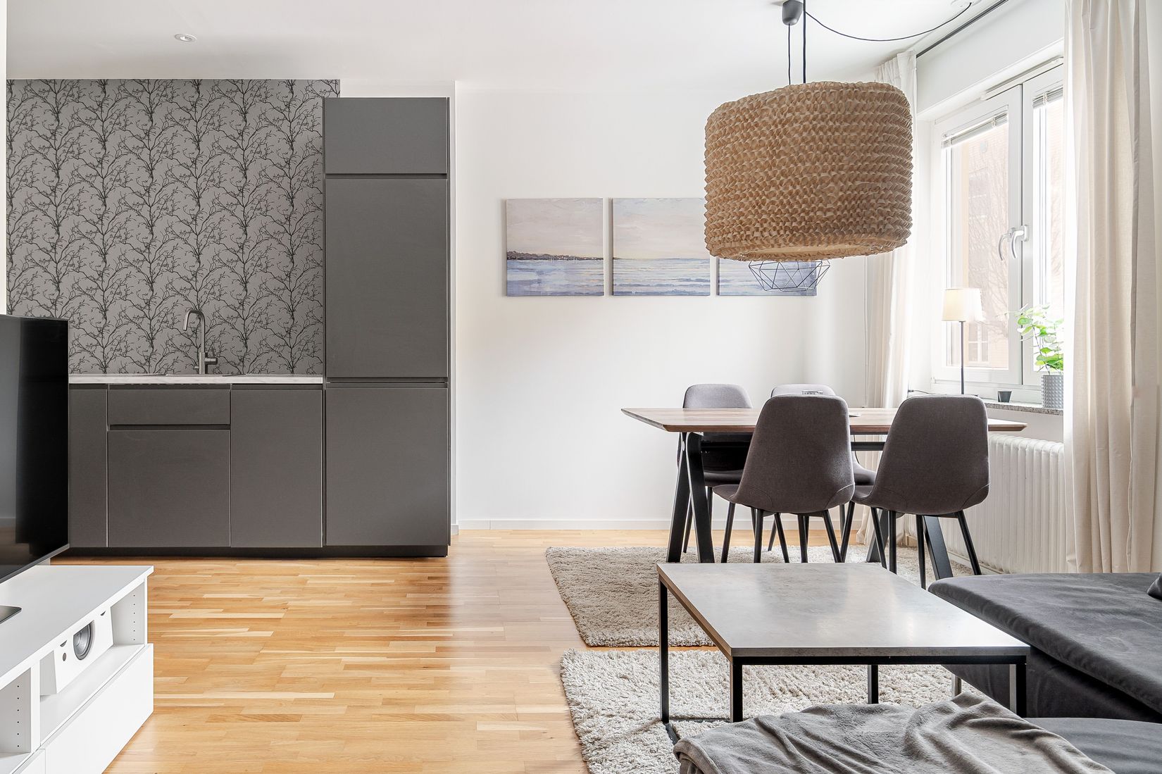 Kök och vardagsrum samspelar i en öppen planlösning som bjuder in till både umgänge och vardagsliv. Köket renoverades 2021 med moderna grå skåpsluckor från IKEA och är utrustat med integrerade vitvaror såsom kyl/frys, diskmaskin, kombinerad ugn och mikro, induktionshäll och fläkt. Här finns gott om plats för matbord och soffgrupp, vilket gör rummet till bostadens naturliga samlingspunkt.