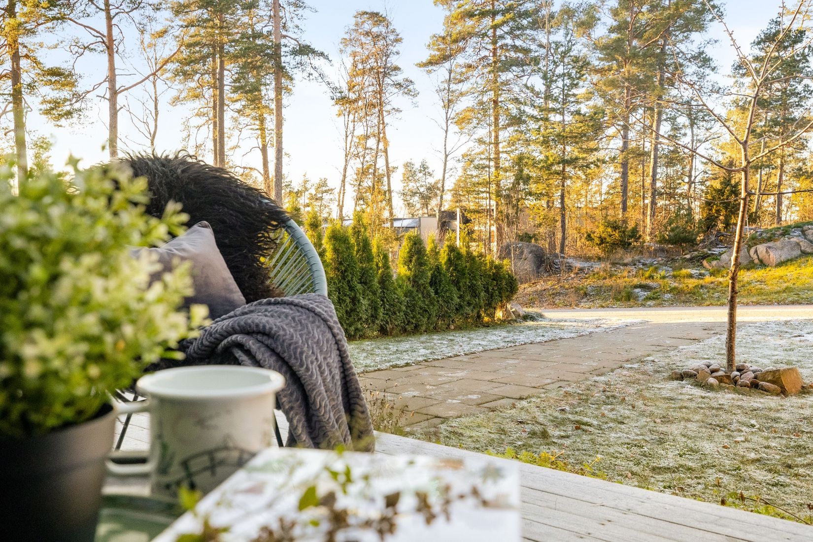 Utemiljöerna är välplanerade med altaner på såväl fram som baksida, växthus och en härlig tomt för lek och planteringar. Ni njuter av härlig kvällssol på såväl fram som baksida vilket skulle göra det idealiskt att bygga en altan i slutet av tomten mot allmänningen. I den intilliggande skogen finner ni många härliga promenadstigar. Området, som är rikt på svamp och bär, passar perfekt för er som vill bo nära naturen men samtidigt bara ca 10 minuter från Åkersberga centrum.