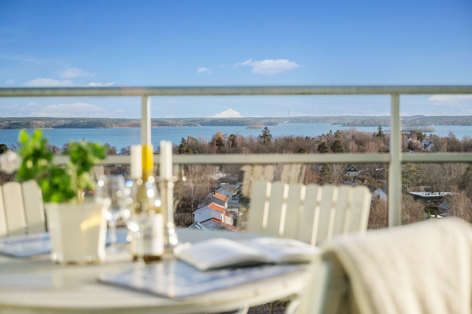 Övre plan bjuder på ett luftigt vardagsrum med imponerande takhöjd och stora fönster som släpper in ljuset och ramar in den milsvida havsutsikten. Här finns även ett extra sovrum, en WC och lägenhetens absoluta höjdpunkt, den privata takterrassen med panoramavy över havet. Perfekt för sommarkvällar med vänner, soliga dagar eller bara att njuta av utsikten!