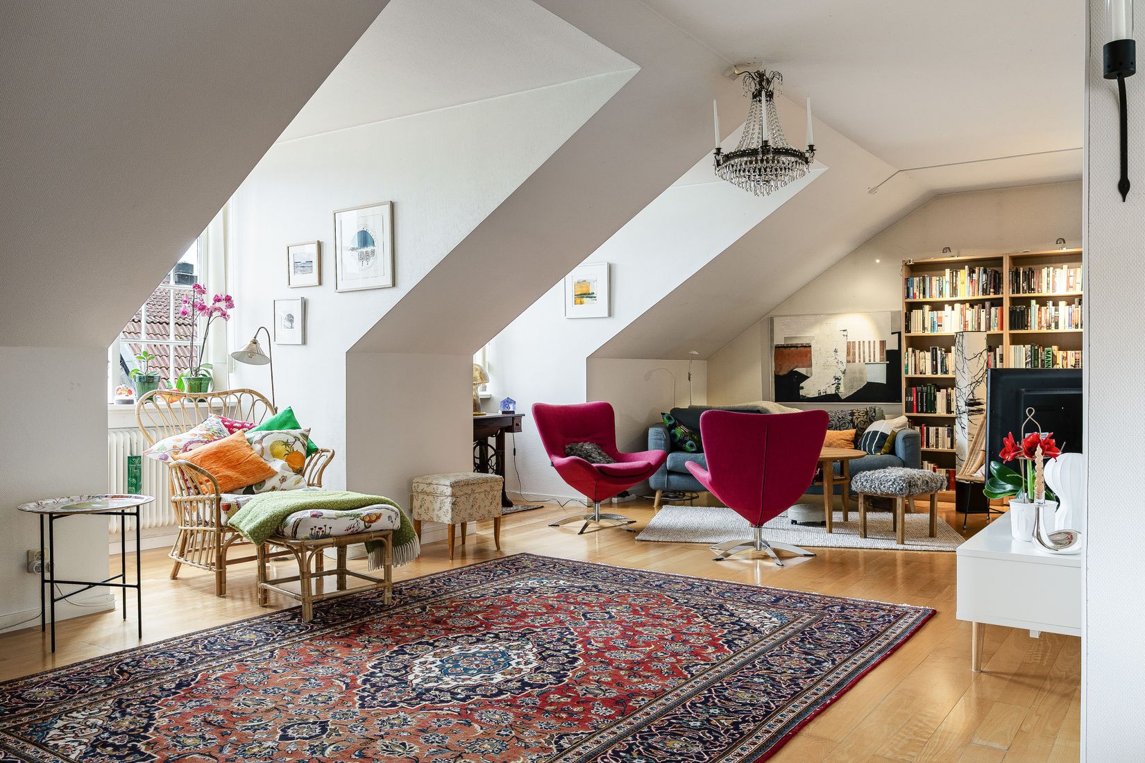 Genomgående möts du av charmiga detaljer som lutande väggar, takfönster, synliga bjälkar och ett fantastiskt ljus – attribut som gör denna bostad unik i sitt slag. Läget är ett av stadens bästa: lugnt och ombonat, men samtidigt bara ett stenkast från Kalmars caféer, restauranger, butiker och kulturutbud.