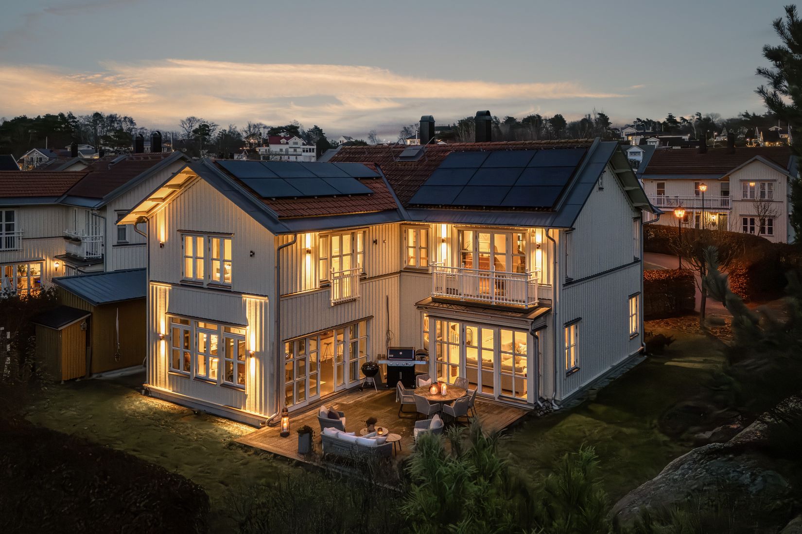 Från köket leder dubbeldörrar ut till den skyddade uteplatsen i soligt och insynsskyddat söderläge. Här blir altanen ett naturligt extra vardagsrum under sommarhalvåret, omgiven av naturtomt, skogskant och berg i dagen – perfekt för både lek och avkoppling.