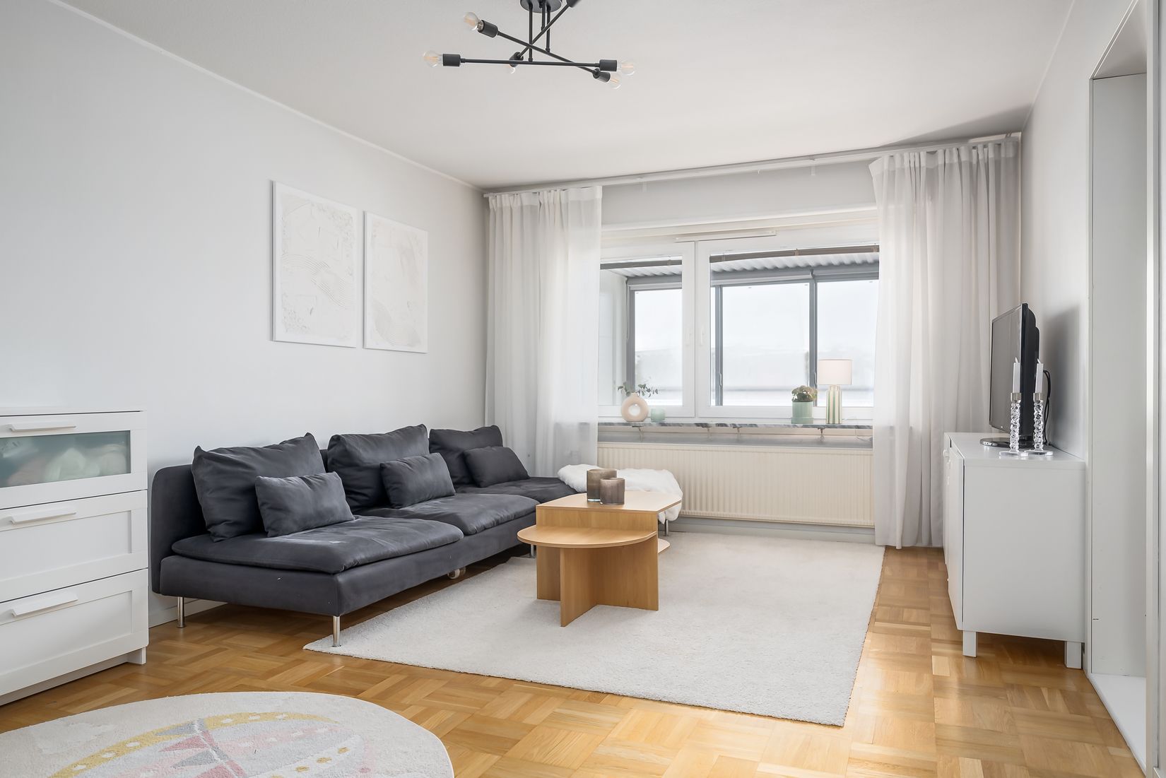 Vidare erbjuder bostaden ett användarvänligt kök med kyl/frys från 2022 respektive diskmaskin från 2023, ett stort och generöst vardagsrum med fint slipat och behandlat parkettgolv, ett väl tilltaget sovrum och en helkaklad dusch/WC som renoverades i samband med föreningens stambyte. Här finns också en kombinerad tvättmaskin- och torktumlare från 2024 som underlättar vardagens bestyr.