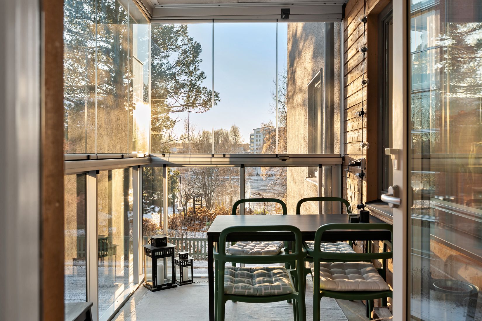Belägen på det andra våningsplanet och med inglasad balkong och dessutom med utsikt direkt mot Skellefteälven finner vi denna välplanerade tvårummare om 52,5 kvadratmeter. Modern planlösning med stort fokus på social yta, öppet mellan kök och vardagsrum. Sovrummet är väl tilltaget med platsbyggda garderober för bästa möjliga förvaring.