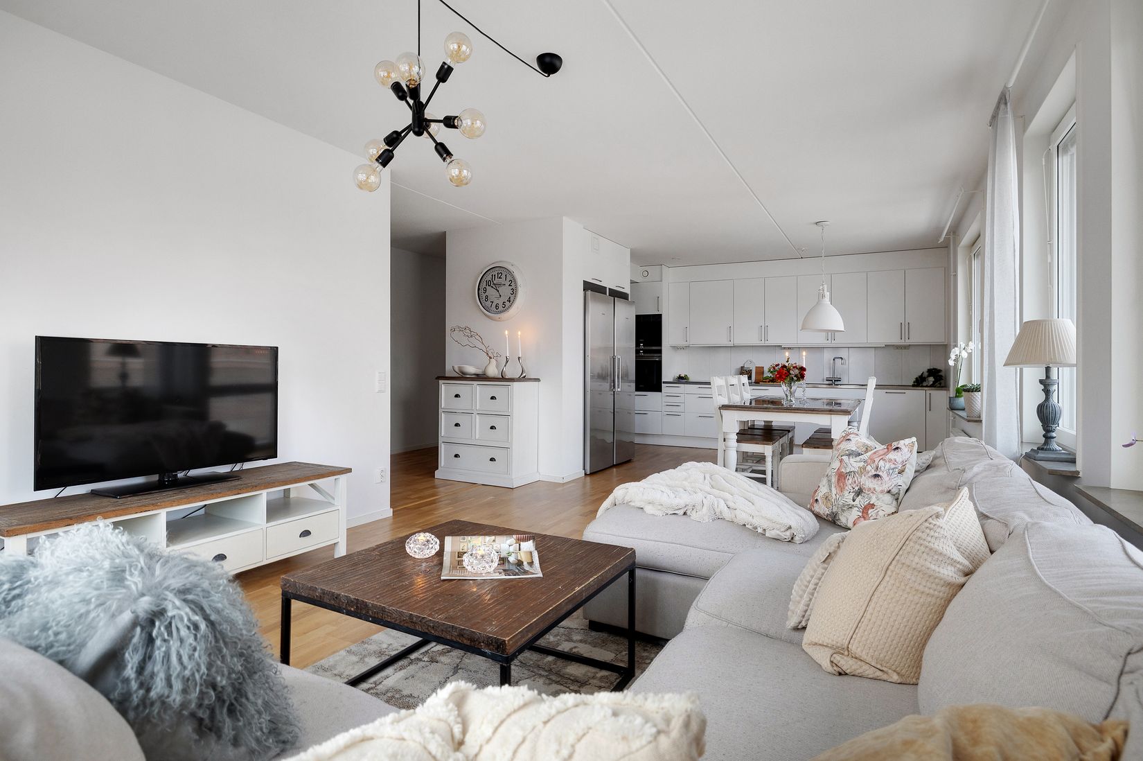 Lägenheten om 81kvm är fördelad på tre rum och kök med genomgående parkettgolv samt ljust målade väggar och härligt ljusinsläpp från fönster i flera väderstreck. Köket är rymligt och har gott om förvaringsutrymmen samt arbetsyta som ger möjlighet för fler att hjälpa till med matlagningen. Invid köket finns plats för ett stort matbord för härliga middagsbjudningar i en öppen planlösning mot vardagsrummet samt utgång till den ena utav bostadens rymliga balkonger.