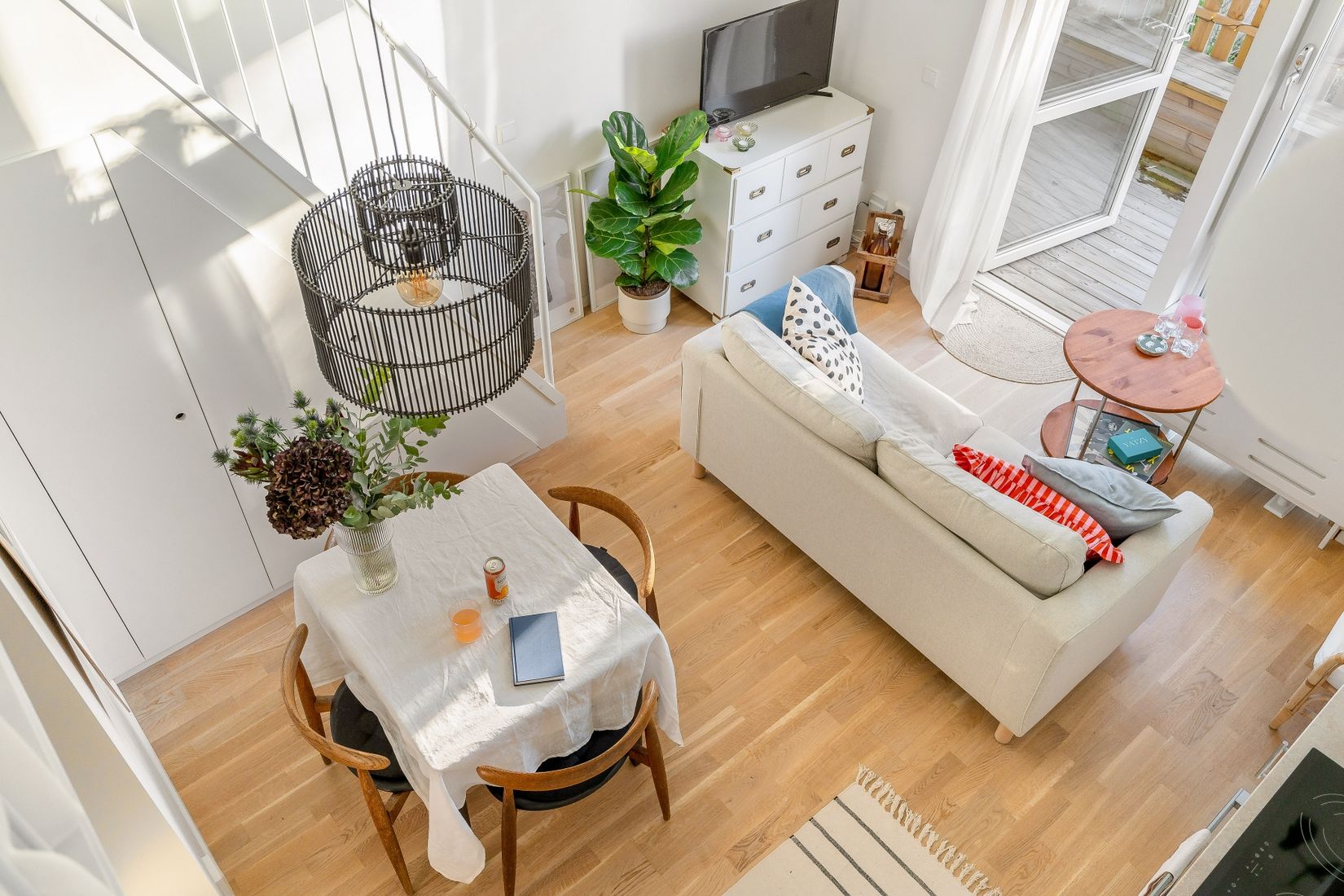 Genomtänkt planlösning och moderna material. Den nedre delen om ca 25 kvm kompletteras av ett rymligt loft på ca 10 kvm med ca 165 cm i takhöjd – perfekt för dubbelsäng och enklare möblering, vilket frigör gott om golvyta i vardagsrummet. Förvaringen är smart planerad och extra yta i form av garderober under trappan.