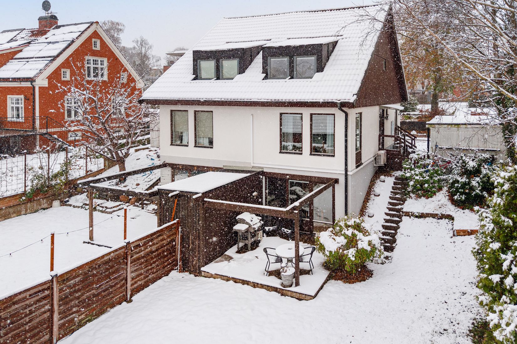 I anslutning till köket ligger vardagsrummet, ett ljust och inbjudande rum med laminatgolv och vitmålade väggar. Här finns gott om plats för både soffgrupp och matbord, och trappan som binder samman våningsplanen skapar en naturlig knutpunkt i hemmet. En trappa upp väntar ovanvåningen med två trivsamma sovrum, båda med laminatgolv och vitmålade väggar. Det renoverade badrummet från 2020/2021 är stilrent och modernt med golvvärme, vitt kakel, mörkt klinkergolv, dusch, handdukstork, kommod och spegelskåp, ett härligt vardagslyxigt inslag. Sovrum 1 är väl tilltaget med förvaring och utsikt mot trädgården, medan sovrum 2 har ett lugnt läge mot den stilla gatan på framsidan. De väl tilltagna sovrummen medför att man enkelt kan utöka till fler sovrum för den stora familjen!