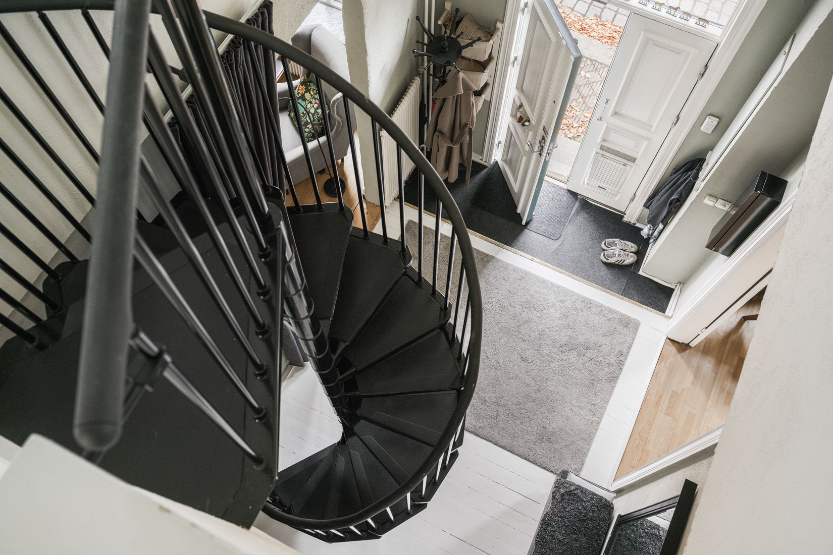 Via spiraltrappan vid entrén, når du det ljusa och luftiga övre planet. Här möts du av öppna, vackra ytor som idag fungerar som kontor och allrum, två bra sovrum samt ytterligare ett badrum med dusch. Ljuset och harmonin följer med genom hela våningen.