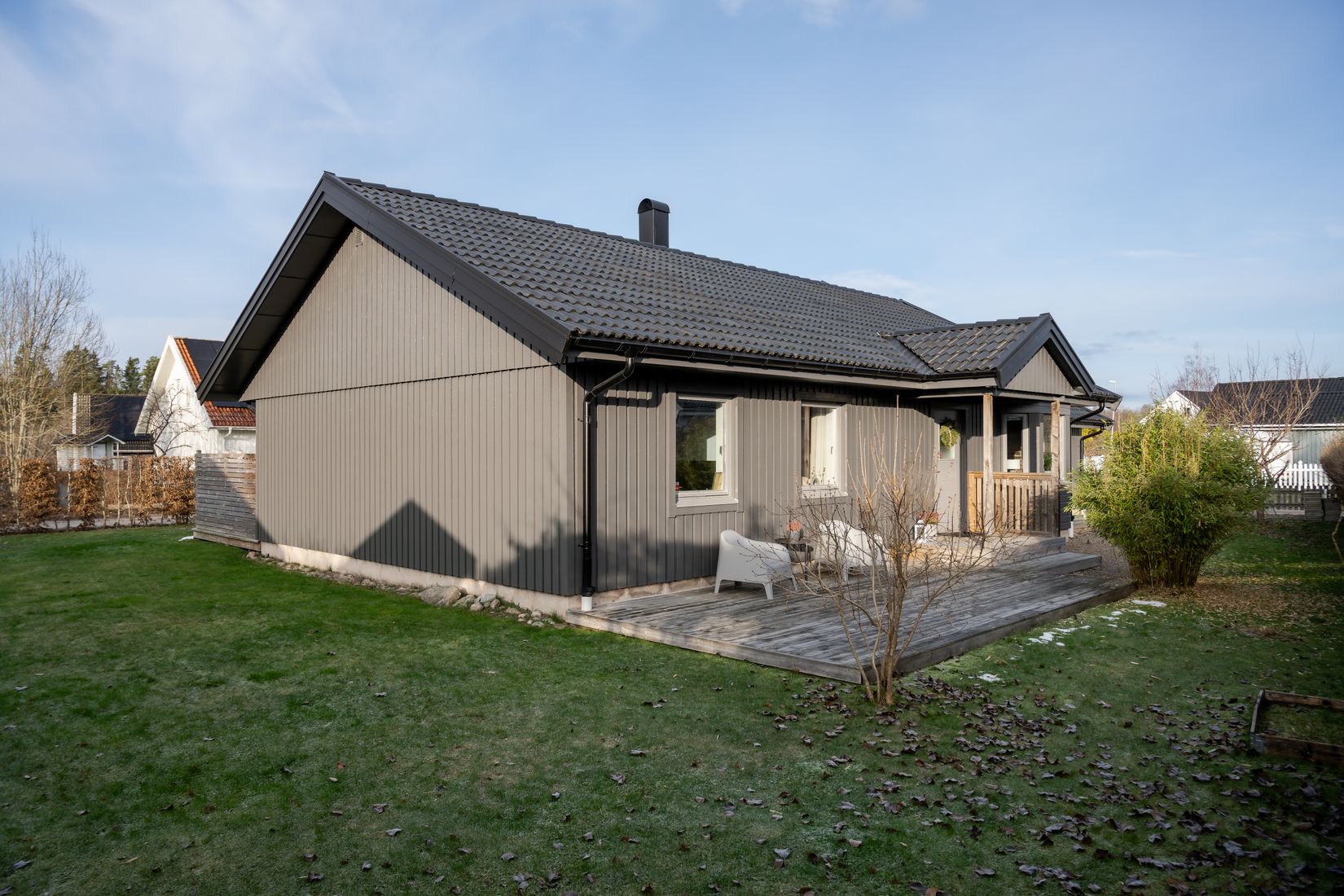 Den lättskötta och plana trädgården bjuder på fina gräsytor som lämpar sig perfekt för lek, odling eller avkoppling. På baksidan finner du en rymlig altan i direkt anslutning till uterummet, en självklar samlingsplats för sommarkvällar och grillstunder. På husets framsida finns ytterligare en altan i sydöstläge där man kan avnjuta morgonkaffet eller sommarfrukosten. Tomten ramas in av en skyddande häck som skapar både insynsskydd och en ombonad känsla. Här finns även en praktisk uppfart med plats för två bilar, vilket gör vardagen smidig för både familj och gäster.