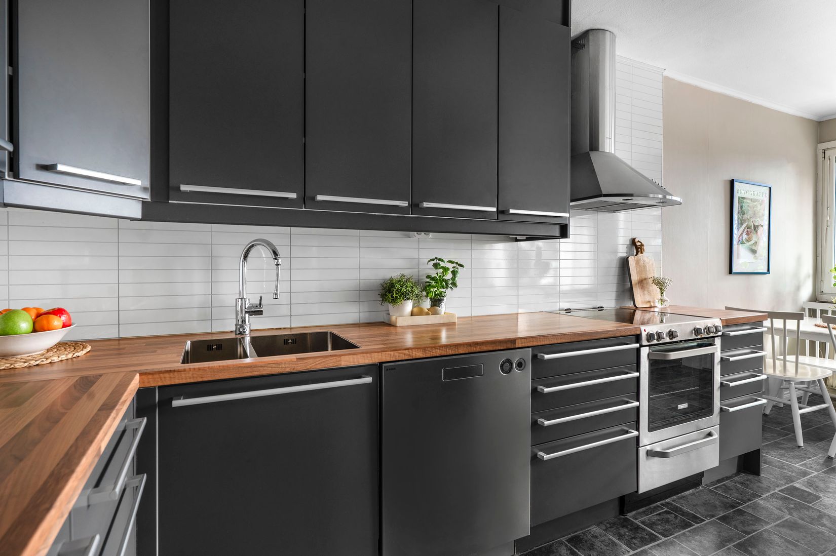 Stig in i den välkomnande hallen som erbjuder gott om plats för att hänga av sig ytterkläder och smart garderobsförvaring. Härifrån når du hemmets mittpunkt – det smakfullt renoverade köket. De släta mörkgråa luckorna skapar en elegant kontrast mot den varma träbänkskivan, vilket ger ett modernt och harmoniskt intryck. Köket är fullt utrustat med häll, fläkt, spis, mikro, integrerad diskmaskin samt kyl/frys. Här erbjuds gott om förvaring i både väggskåp och lådor, samt plats för ett matbord där du kan njuta av måltider med utsikt mot balkongen som du når från köket.