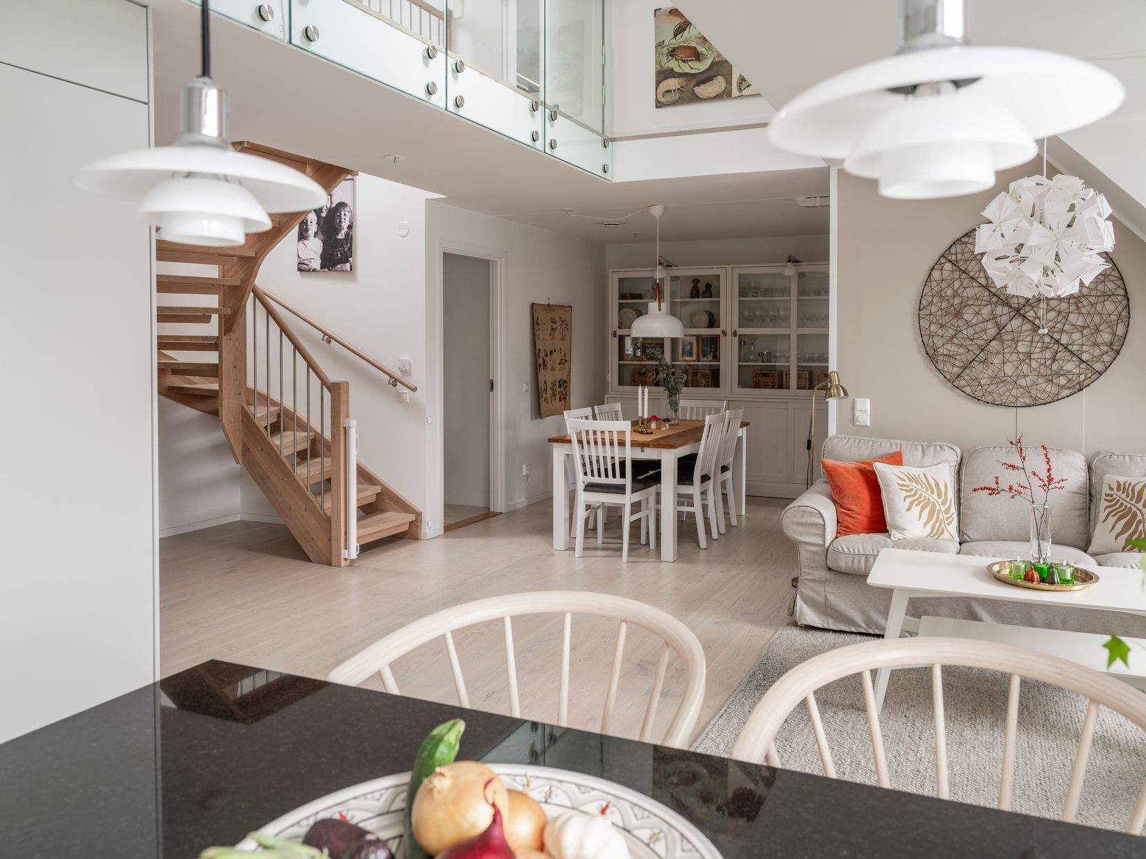 Hela lägenheten andas våningskänsla och de många fönsterpartierna släpper in härligt ljus och ger den där luftiga och rymliga känslan som vi alla eftersöker i våra hem. Det ligger genomgående vitlaserad 1-stavs ekparkett i hela lägenheten förutom klinkergolv i hall och badrummen. Kök och vardagsrum bildar tillsammans generösa sällskapsytor att umgås på där man enkelt kan duka upp för större tillställningar. Den trivsamma köksön blir pricken över i:et. Köket håller hög kvalitet med bland annat granitskivor och genomgående vitvaror från Miele. Vidare finns terrassen i rakt söderläge med gott om sol och med takåsarna som närmaste granne.