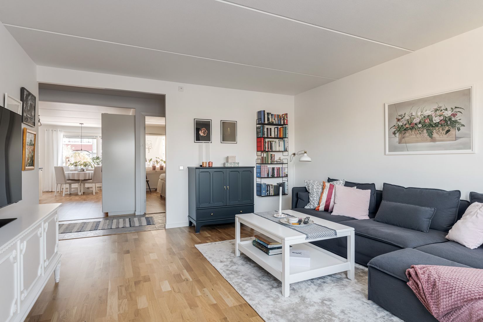 Lägenheten har en genomtänkt planlösning med öppen planlösning mellan kök och vardagsrum och ett kvadratsmart sovrum.