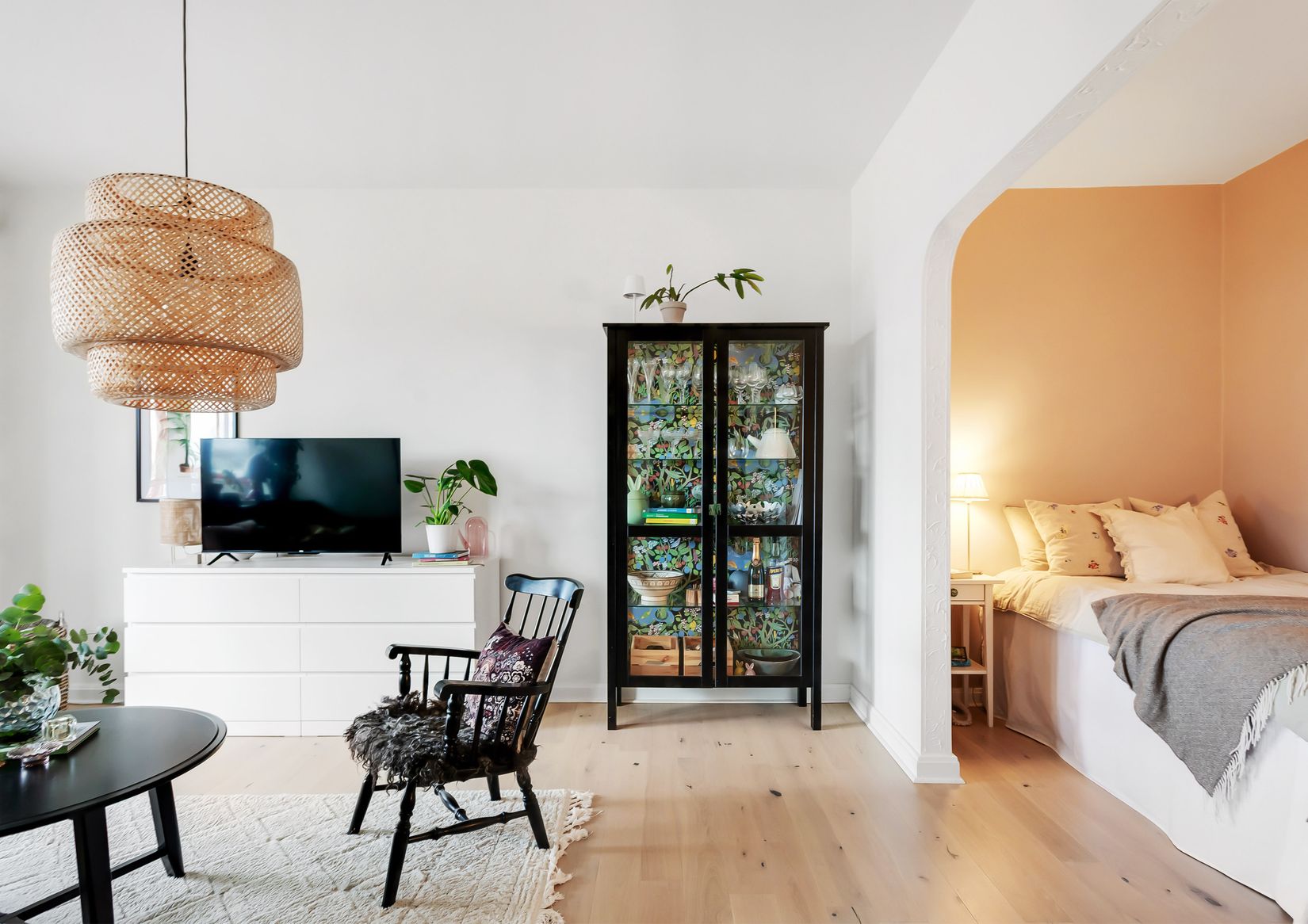 Det rymliga vardagsrummet ger gott om plats för umgänge och sovallkoven rymmer en stor säng samt förvaring. Köket är bevarat med charm och i mycket fint skick med nylackerade luckor och delvis nya vitvaror, likaså badrummet som är uppfräschat och det finns en stor och praktisk klädkammare i hallen.