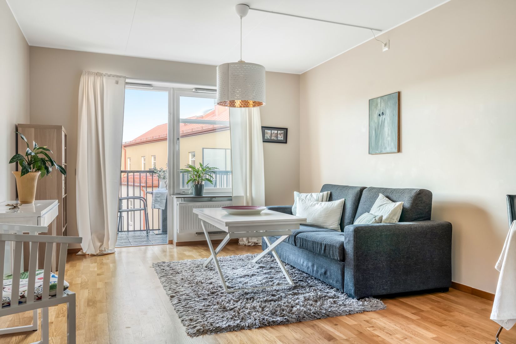 Den öppna och sociala ytan mellan det välutrustade köket och det rymliga vardagsrummet skapar en harmonisk helhet med utmärkta möjligheter för både avkoppling och umgänge. Från vardagsrummet nås även bostadens balkong, belägen i rofyllt läge mot innergårdens grönska – en perfekt plats för såväl morgonkaffe som kvällsro.