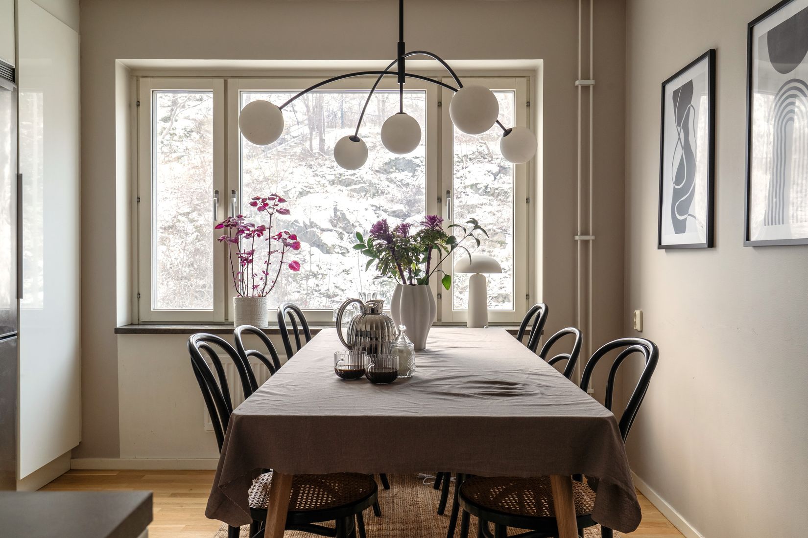 Bostaden präglas av en harmonisk och genomtänkt känsla redan i hallen, där de stilrena materialvalen och kulörer sätter tonen för resten av hemmet. Det rymliga vardagsrummet utgör lägenhetens naturliga samlingspunkt med gott om plats för både soffgrupp och arbetshörna om så önskas. Den halvöppna planlösningen mot köket skapar en härlig social yta, vilket är perfekt när man vill umgås medan middagen förbereds, eller bara njuta av hemmet på ett naturligt sätt. Från vardagsrummet når ni den soliga och möblerbara balkongen. Här får ni dessutom använda gasolgrill, vilket gör det enkelt att bjuda in till grillkvällar och skapa sommarstämning även mitt i veckan. Köket är både funktionellt och stilrent, med bra arbetsytor och gott om förvaring, något som gör matlagningen smidig och trivsam. Det fräscha badrummet är inrett i tidlösa material och utrustat med tvättmaskin för extra bekvämlighet. Utöver detta finns gott om förvaringsmöjligheter i klädkammare och garderober. Till lägenheten hör ett förråd i samma hus, och tack vare hissen som tar dig hela vägen ner till föreningens egna garage blir vardagen extra bekväm.