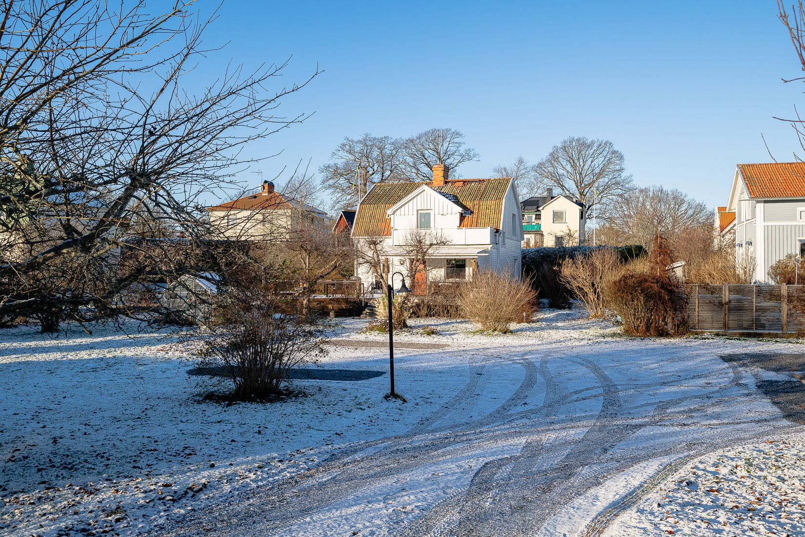När du kör in på fastigheten möts du av en stor, nygrusad parkeringsplats med gott om utrymme för flera fordon. En stensatt gång leder direkt fram till entrén, via en trappa över den rymliga trädäckade altanen. Altanen byggdes till 2025 och erbjuder en härlig social yta samt en nedsänkt, vedeldad skärgårdsbadstunna – perfekt för både avkoppling och umgänge.