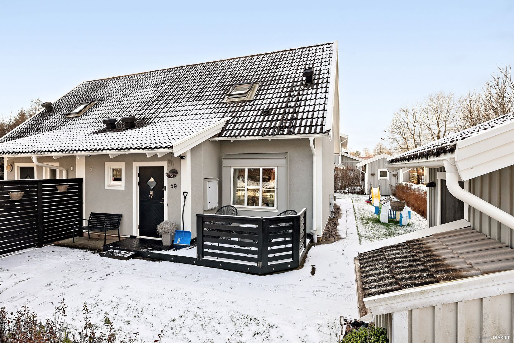 Till bostaden hör dessutom ett separat förråd på tomten – idealiskt för förvaring av cyklar, verktyg eller säsongsprylar – samt garage i en intilliggande gemensam länga.