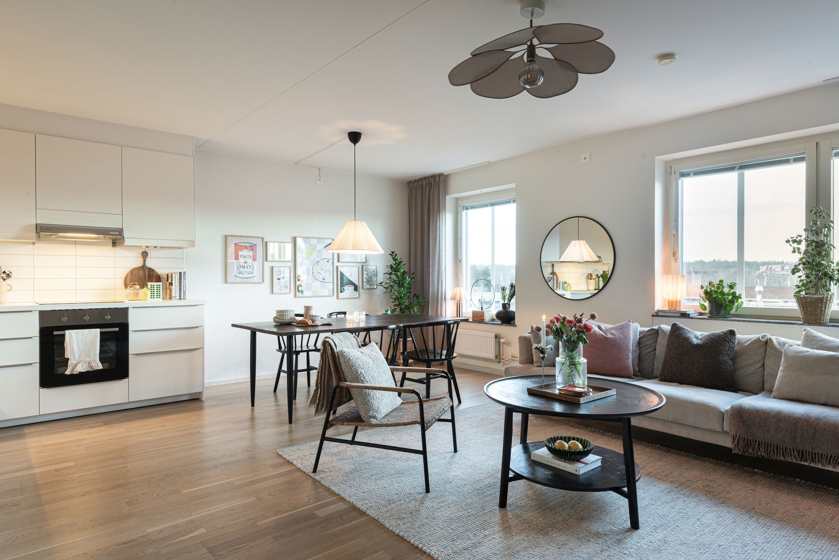 Det generösa vardagsrummet får ett underbart ljus från stora fönsterpartier och erbjuder flexibel möblering för både soffgrupp och matplats.