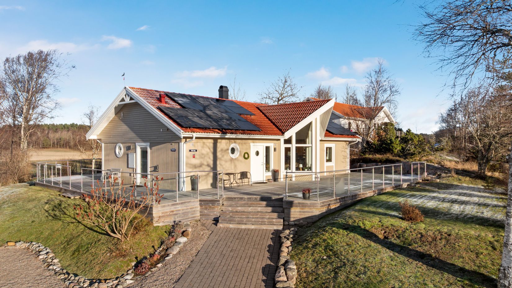 Fastigheten har moderna bekvämligheter som solceller, fiber, vattenburen golvvärme och elbilsladdare. De härliga sociala ytorna inkluderar ett uterum samt altan om ca 200 kvm, vilken löper runt tre sidor av huset med vackra glasräcken, där du kan njuta av sol hela dagen. Det lantliga läget ger en lugn och avslappnad atmosfär med fina vyer.