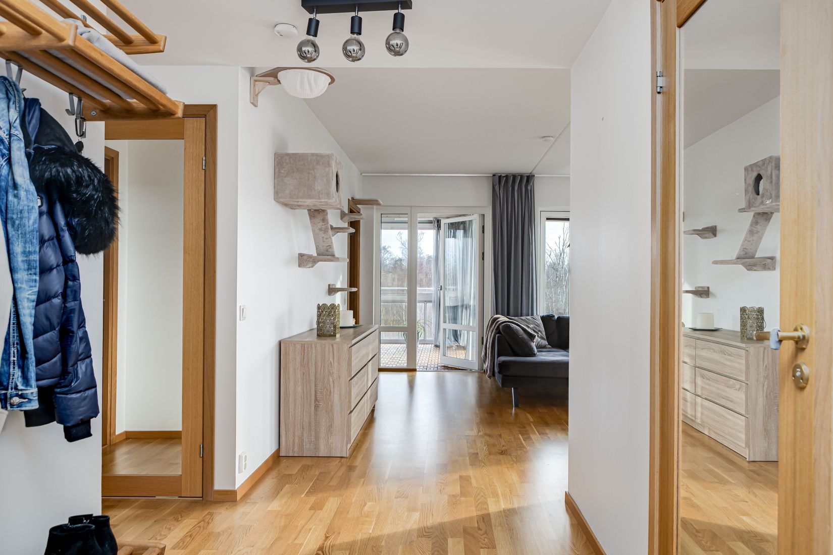Redan i entrén möts du av ett snyggt klinkergolv som övergår i varm parkett. Den öppna kopplingen mot köket skapar en ljus och välkomnande helhet. Lägenheten har genomgående hög standard, inte minst genom de massiva innerdörrarna i ek, kvalitativa tillval som både syns och känns.