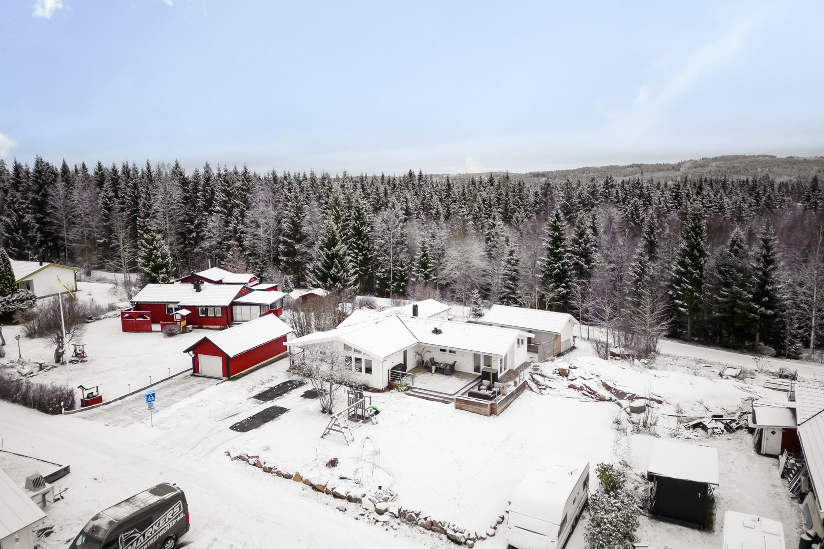 Inne i vårt trevliga hus efter entrén nås man av en varm öppen planlösning där vardagsrum, matsalsdel och kök blir till ett. Sovrummen ligger uppradade och för den större familjen finns det möjlighet till hela fem sovrum. Säljarnas favorittillhåll är det nybyggda uterummet som ligger trevligt avskilt. Huset har ett större badrum med både dusch och badkar samt en gäst WC intill entrén. Välkomna hem till detta direkt inflyttningsklara hus, plats för den växande familjen!