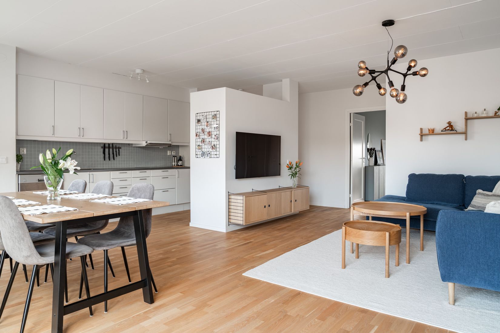 Köket är modernt och välutrustat med ordentliga arbetsytor och bra skåpförvaring – en självklar samlingspunkt för familjen. Härifrån når ni även den stora balkongen som bjuder på många soltimmar och är som gjord för sommarens grillkvällar, odling eller lugna morgnar med kaffe i handen.