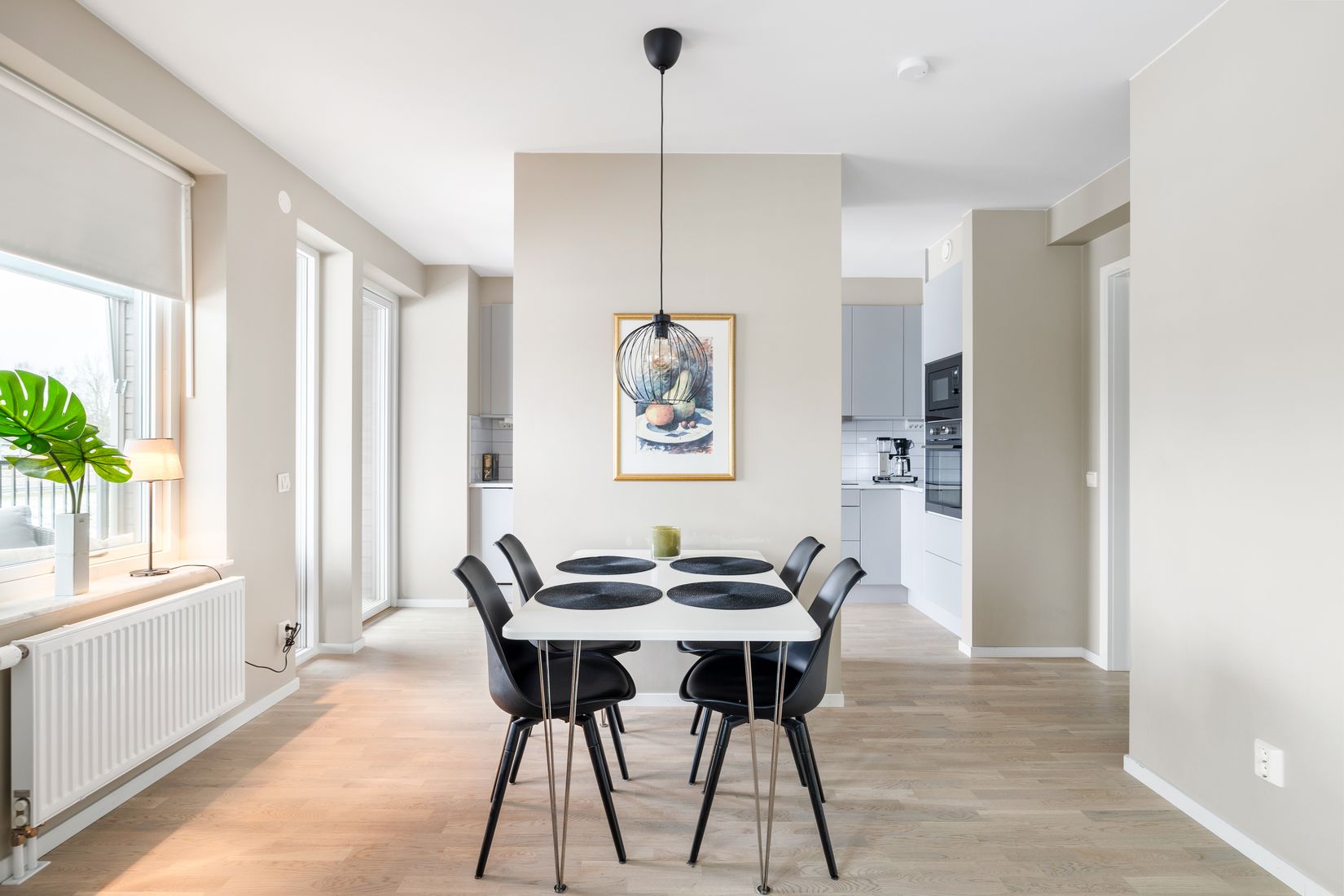 Planlösningen är smart och välplanerad med två rymliga sovrum samt ett stilrent kök som gör matlagningen både enkel och njutbar. Här finns hel kyl och frys, integrerad diskmaskin, generösa förvaringsmöjligheter, vacker bänkskiva i marmorliknande laminat samt en pelare med ugn och mikro placerade i bekväm arbetshöjd. Hemmets sociala ytor bjuder in till umgänge – vardagsrum och matplats flyter samman på ett naturligt och öppet sätt. Genomgående ekparkett, kaklat golv i hallen, vita innerdörrar och gedigna fönsterbänkar i sten skapar en tidlös och attraktiv helhet.