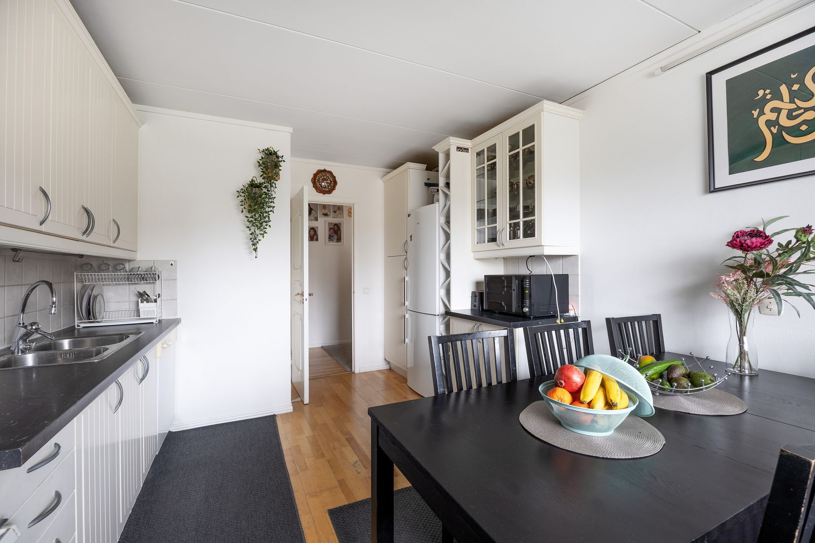 Köket är funktionellt och stilrent med gott om arbetsyta och förvaring. Lägenheten har ett helkaklat badrum med badkar samt en praktisk gäst-wc – en uppskattad detalj i vardagen och vid besök.