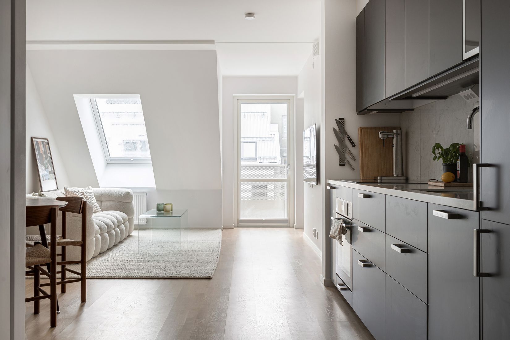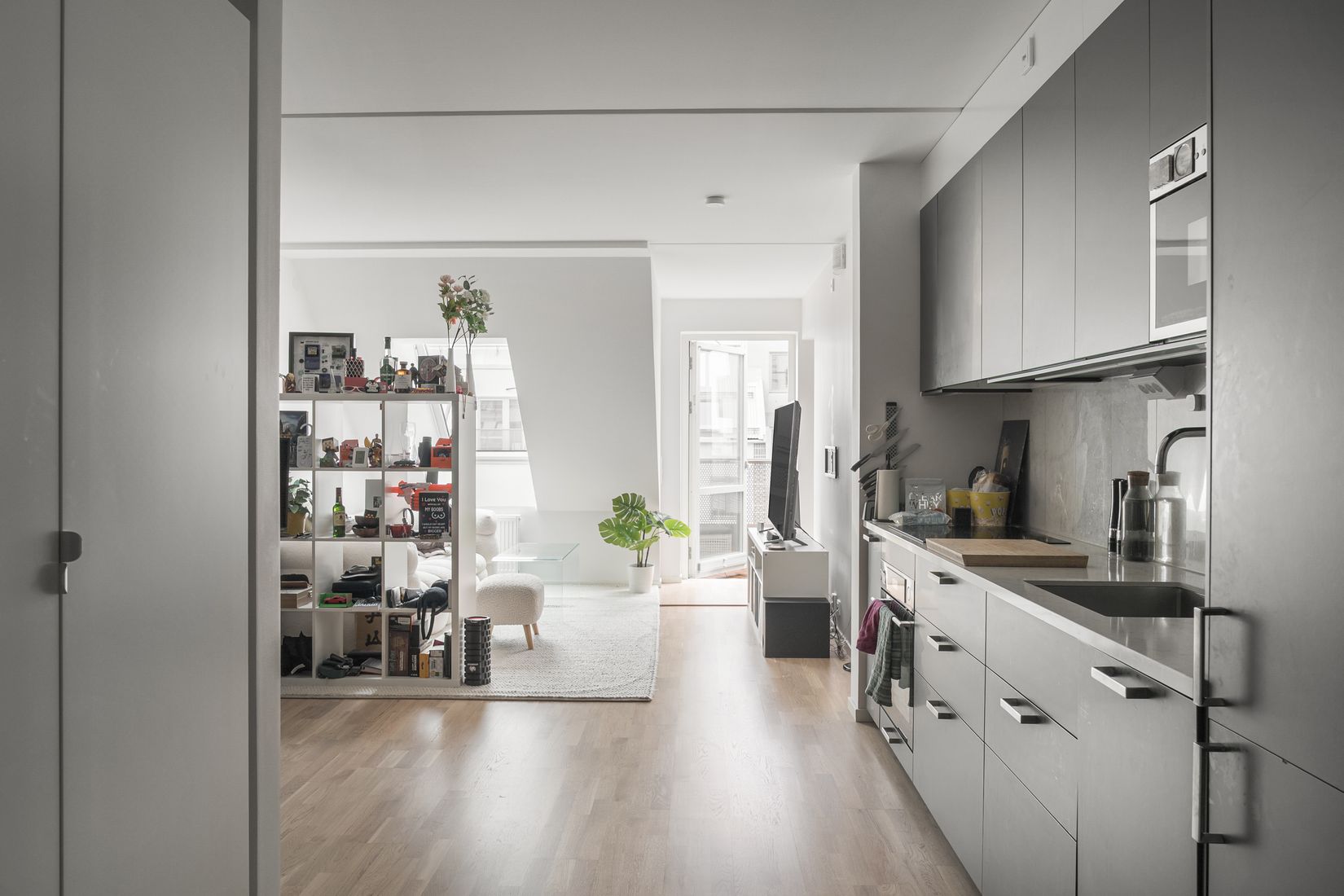 Köket går i modern svart ton med bänkskiva i stenkomposit Bianco Palazzo och matchande ljus kakelsättning. Utrustningen består av inbyggnadsugn, induktionshäll, mikrovågsugn, integrerad diskmaskin samt kombinerad kyl och frys.Badrummet är helkaklat i vitt med grå klinker och utrustat med takdusch, kommod, handdukstork samt kombinerad tvättmaskin och torktumlare.