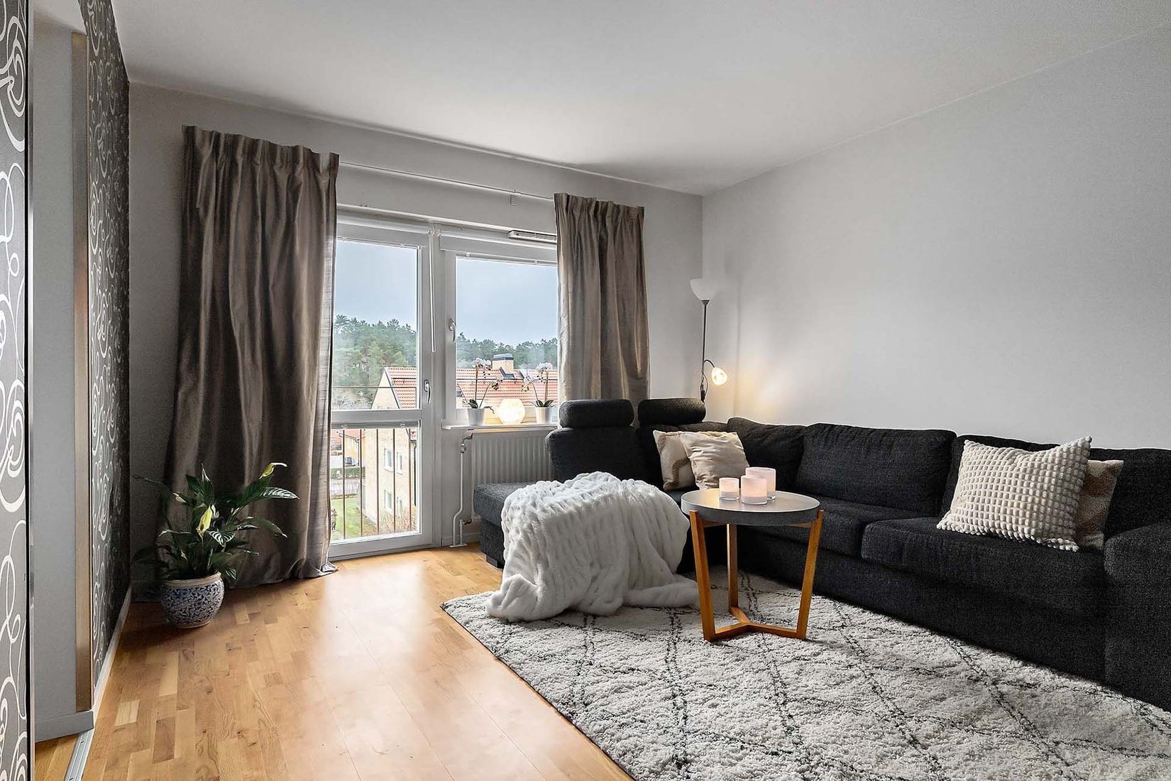 Lägenheten har en rymlig hall med separat klädkammare som erbjuder utmärkt förvaring. Köket är hemtrevligt och funktionellt med fräscha vitvaror, släta valnötsluckor och plats för matbord. I vardagsrummet finns gott om yta för både soffa och matplats, och bokyllan och väggen mot sovalkoven gör rummet lättmöblerat och ombonat. Den franska balkongen bjuder in ljuset och öppnar upp mot utsikten.