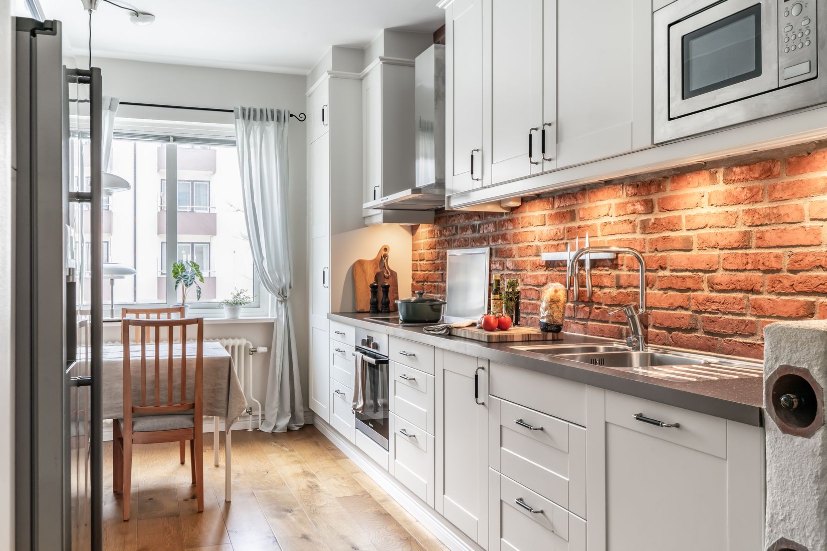 Köket från Ikea erbjuder gott om förvaring och arbetsyta, perfekt för både vardagsmatlagning och helgens middagssällskap. I det helkaklade badrummet finns både golvvärme och en smidig toppmatad tvättmaskin.