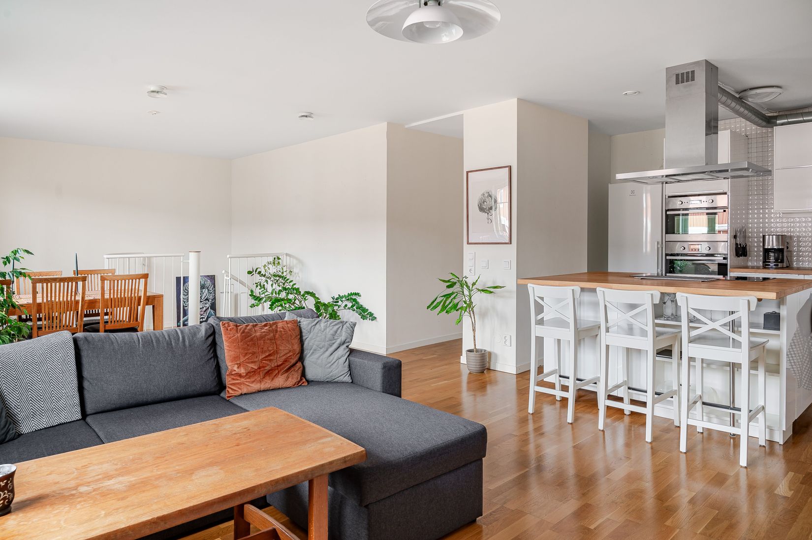 Vardagsrummet är bostadens naturliga samlingspunkt. Här samsas yta och ljus i en öppen och social planlösning som ger en fin kontakt mot det moderna köket. Köket är smakfullt renoverat och utrustat med kvalitativa materialval, gott om arbetsyta och smarta lösningar för den matlagningsglade. Från vardagsrummet når ni även den stora balkongen som bjuder på många soltimmar och en perfekt plats för avslappning eller trevliga sommarkvällar.