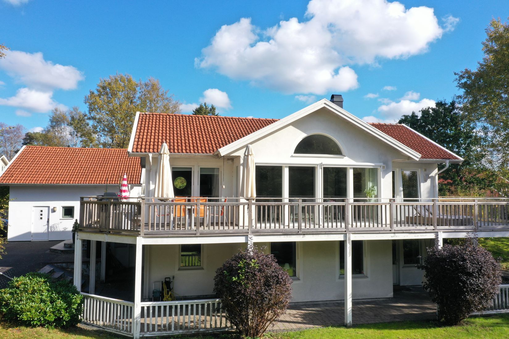 Här bor du med sol från morgon till kväll – under sommartid kan du njuta av solnedgången ända fram till klockan 21. Huset erbjuder fyra till fem sovrum och en planlösning som passar både den större familjen och den som vill kombinera bostad med hemmakontor. Entréplanet präglas av ett generöst vardagsrum med takhöjd upp till nock och direkt utgång till en altan i flera etage med fin vy över trädgården. Här finns även ett rymligt kök med bra arbetsytor, matplats och öppen spis. Bostaden har två helkaklade badrum, varav ett med badkar och ett med dusch, samt en relaxavdelning på nedre plan med bastu. Här finns också flera sovrum, klädkammare, tvättstuga och gott om förvaring. Golvvärme finns på båda planen för en behaglig inomhuskomfort året runt.