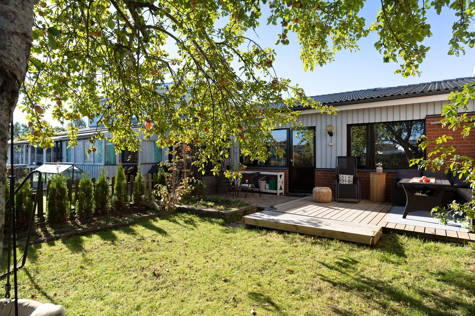 Bostaden har en härlig baksida med altan och en trädgårdstomt i direkt anslutning, där ett vackert äppelträd skapar både charm och karaktär. Här finns gott om plats att njuta av lugnet, odla eller låta barnen leka. Dessutom erbjuder framsidan en trevlig uteplats, vilket gör att du enkelt kan följa solen från morgon till kväll.