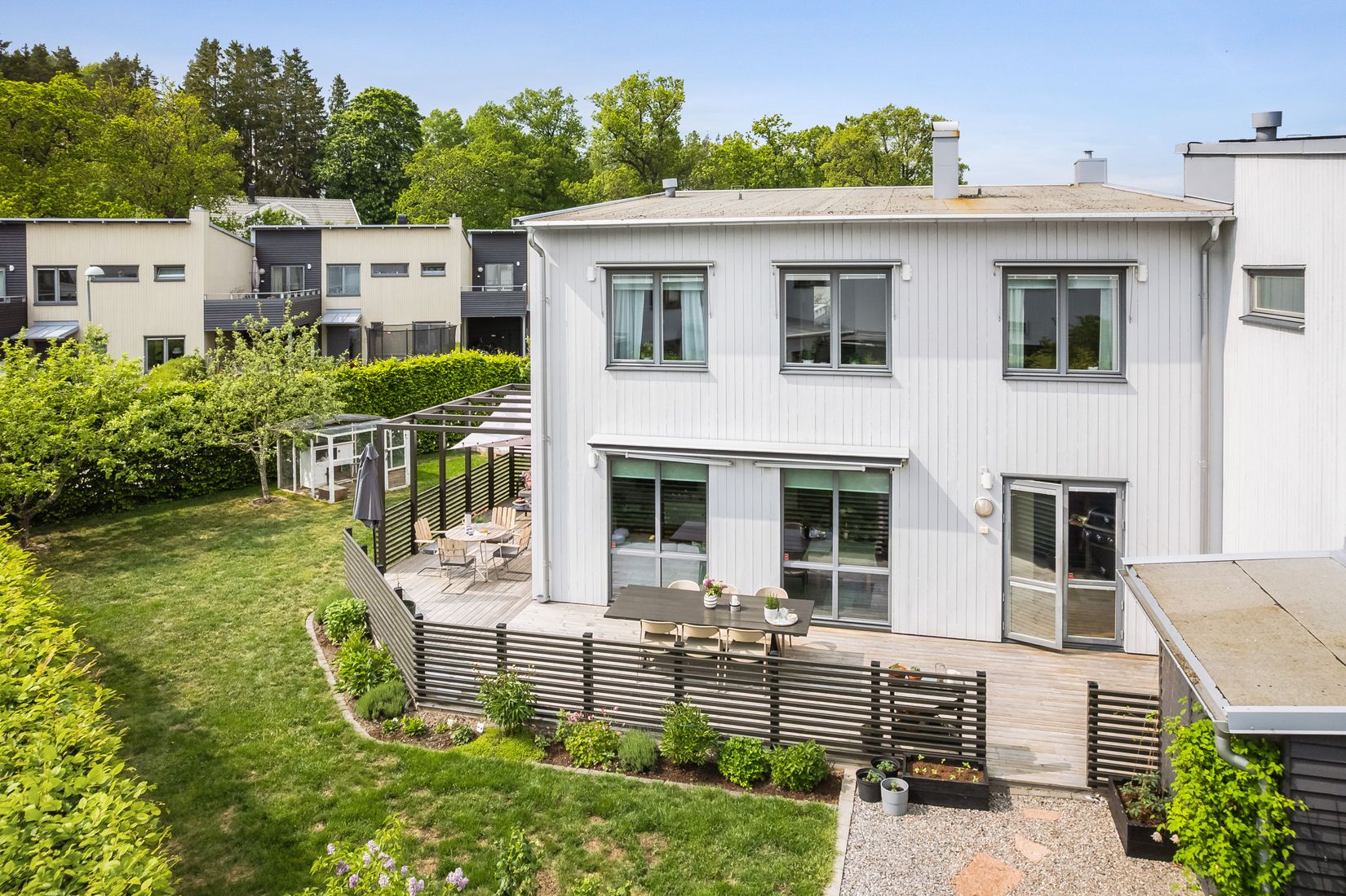 Den ljuvliga trädgårdstomten badar i sol hela dagen och erbjuder en egen skyddad och grönskande oas där lata semesterdagar kan tillbringas i solstolen. Allt effektfullt inramat av den uppväxta avenbokshäcken. Det spatiösa trädäcket går i vinkel runt huset och utgör ett extra sällskapsrum under sommarhalvåret. Här kan midsommarluncher, grillkvällar och kräftsskivor avnjutas i goda vänners lag. Tomten erbjuder även vackert blommande perenner tre äppelträd och generösa gräsytor för kubbspel och bollekar. Behöver man svalka sig efter en svettig fotbollsmatch är det bara att lägga handduken om axlarna och strosa ner till bryggan för ett svalkande dopp. För den trädgårdsintresserade finns gott om plats för egen odling i rabatter och pallkragar. På den inbjudande entrésidan finns det härliga spabadet där avkopplande stunder kan avnjutas efter fartfyllda dagar.