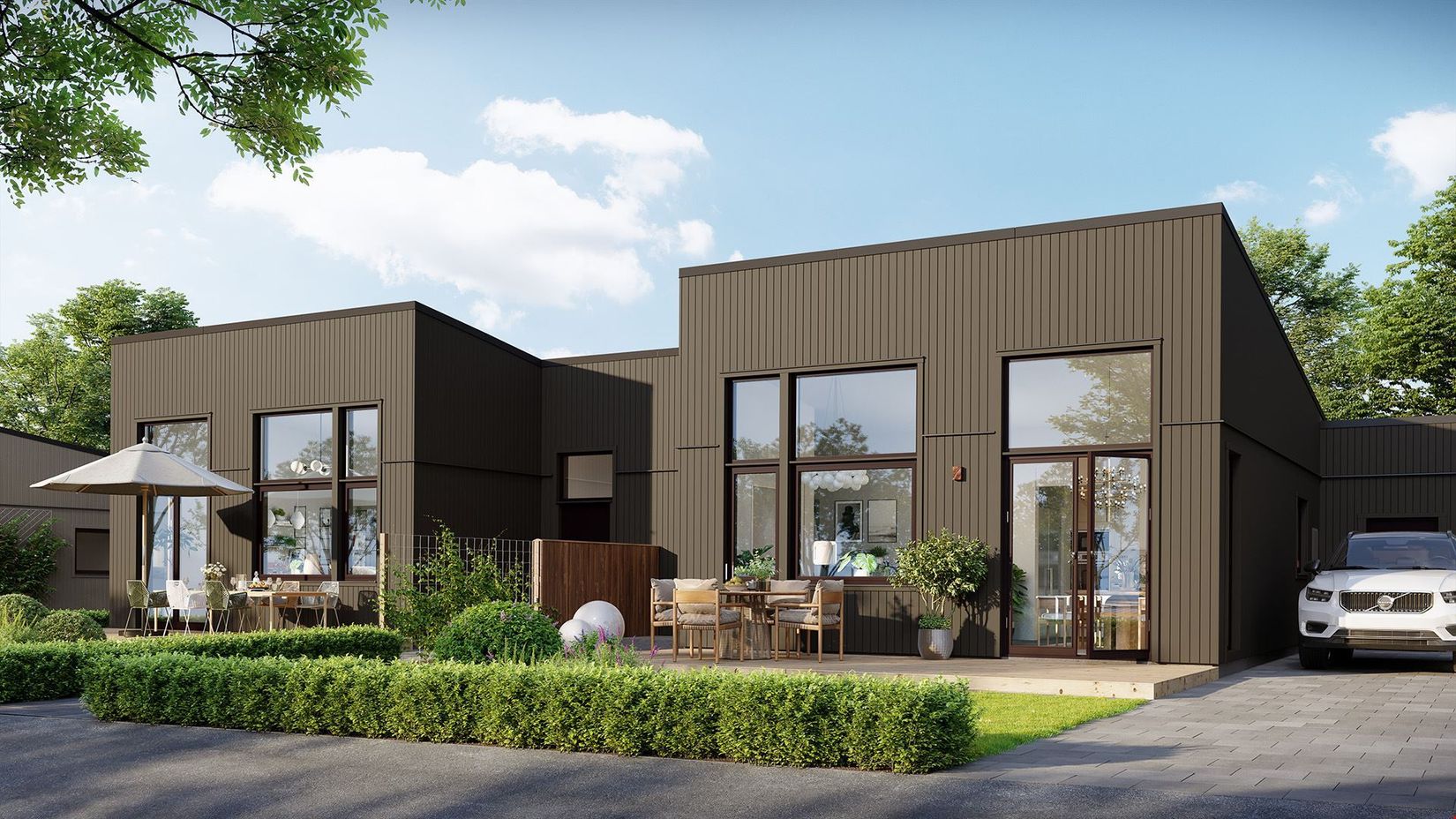 Det mindre av de två husen, på 77 kvm, passar perfekt för paret eller den lilla familjen som uppskattar sociala ytor och en lättskött planlösning. Här möts du av ett öppet samband mellan kök, matplats och vardagsrum - idealiskt för middagar, umgänge och lediga helger. Två sovrum, varav ett master bedroom med klädkammare, kompletteras av ett flexibelt rum som fungerar lika bra som gästrum, hemmakontor eller barnrum. Från vardagsrummet når du uteplatsen, en naturlig förlängning av hemmet under årets soliga dagar.