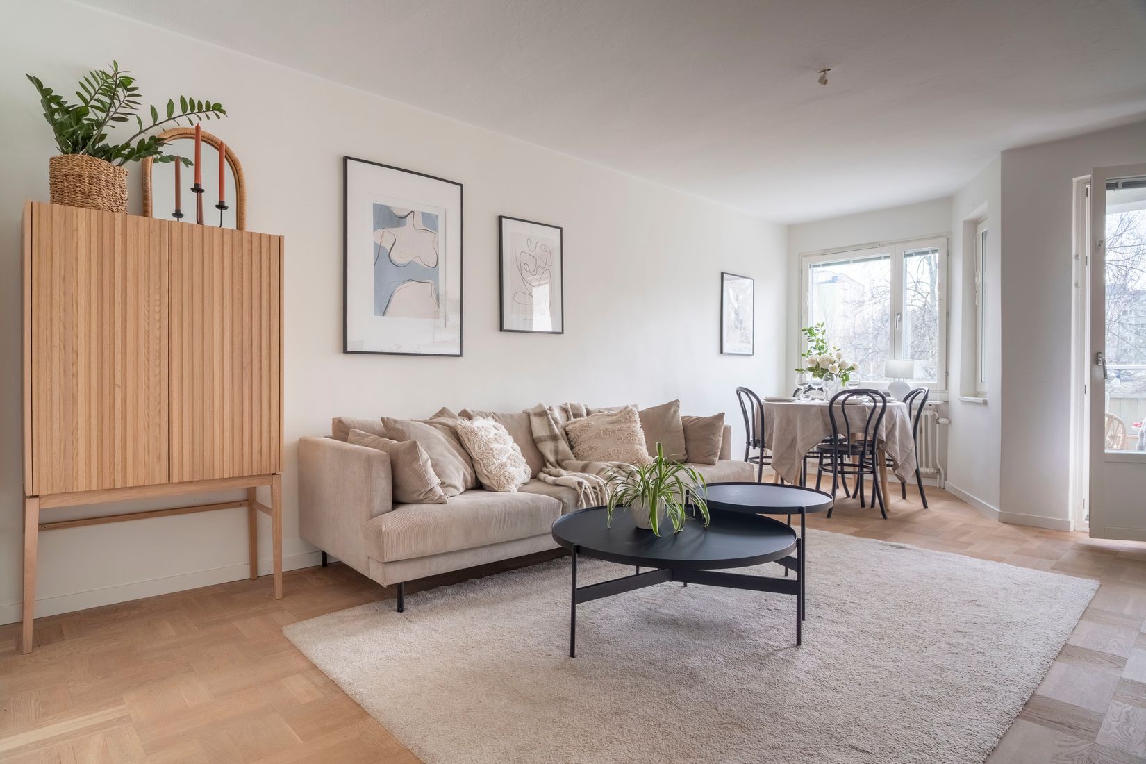 Det generösa vardagsrummet erbjuder plats för både en trevlig sällskapsdel och en matplats för dig som gillar att samla vänner och familj. Härifrån nås även den möblerbara balkongen i soligt söderläge – perfekt för avkoppling från tidig förmiddag till sen eftermiddag.