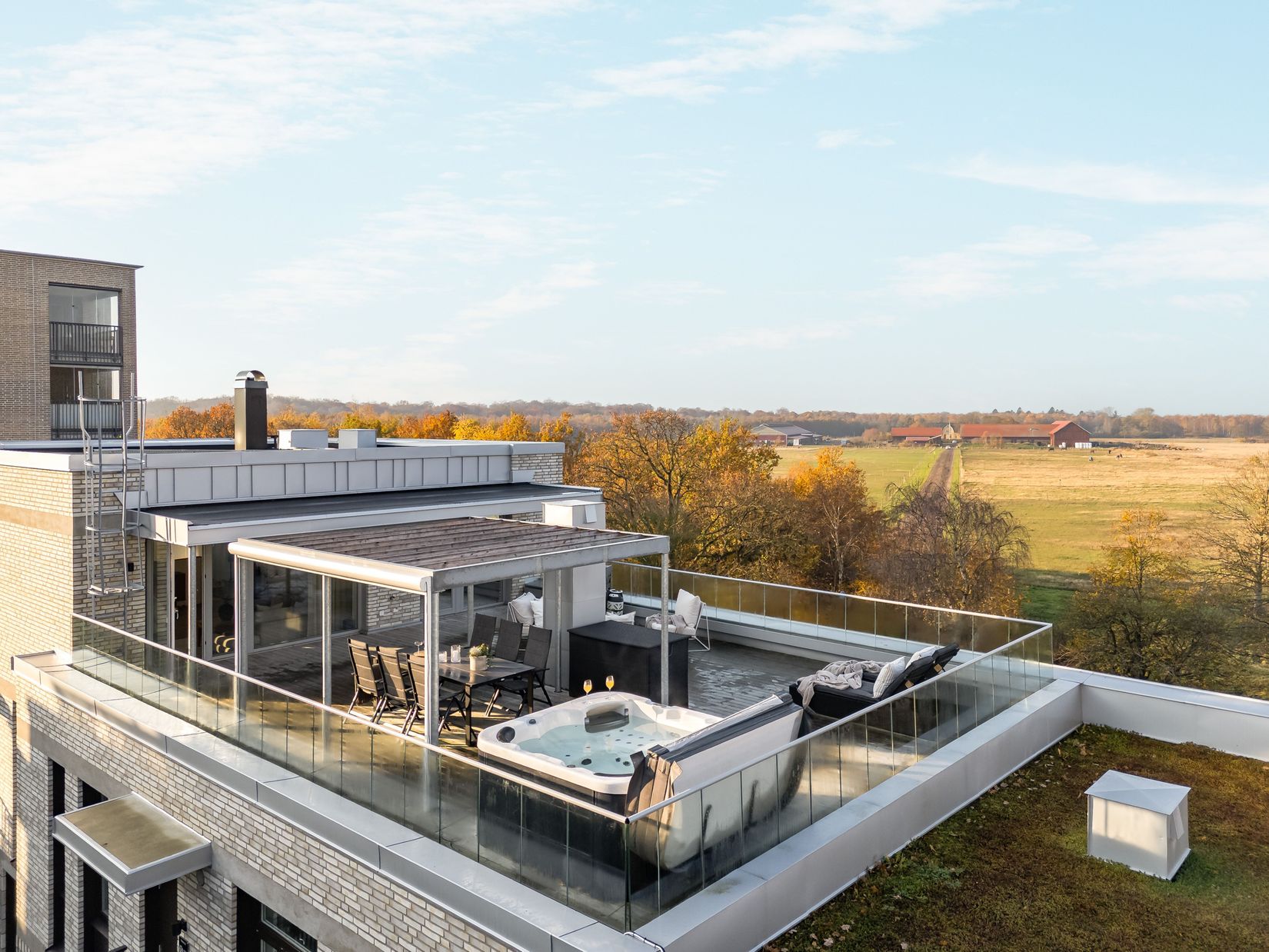 Det som verkligen definierar detta hem är den privata takterrassen. En imponerande yta om cirka 100 kvm som svävar över omgivningen likt en egen sky lounge. Här får du ett privat utomhusliv, insvept i lugn och grönska. Terrassen erbjuder alla möjligheter att skapa något extraordinärt. Generösa loungedelarna för solen, en stilfull matplats för långa grillkvällar i skymningen, en jacuzzi och zoner för växter och grönskande inslag. Allt med utsikt över omgivande hagar och skog som skapar en känsla av avskildhet och exklusivt lugn. Detta blir en självklar förlängning av hemmet där vardag och fest får en ny upphöjd dimension.