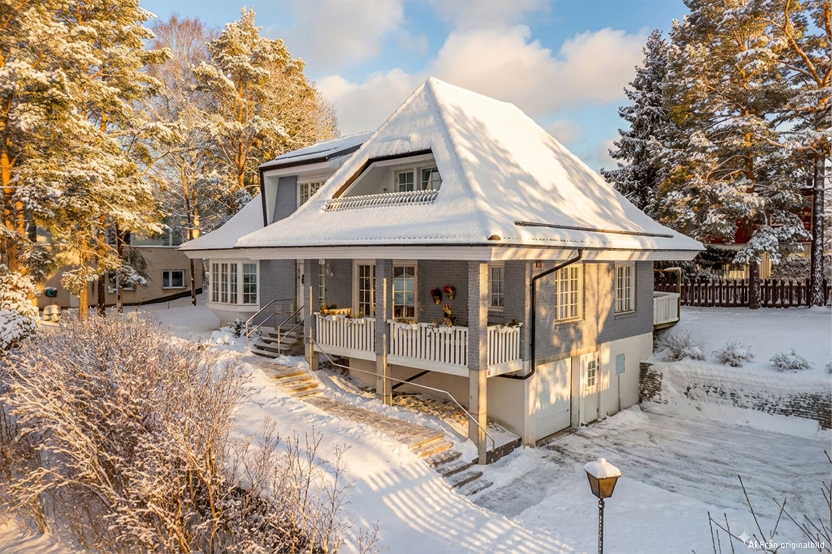 Redan vid entrén möts du av en pampig hall med öppet upp till övre plan, bröstpanel, takrosetter och djupa fönsternischer som ger hemmet en elegant och påkostad känsla. De stora, sammanhängande sällskapsytorna skapar en naturlig plats för både vardag och fest, och det exklusiva Tibro-köket håller mycket hög standard. Här finns 4–5 sovrum, ett helkaklat badrum, separat gäst-wc samt en praktisk tvättstuga. I vardagsrummet finns dessutom förberett för installation av öppen spis för den som önskar extra trivsel. Under huset väntar ett rejält inomhusgarage med plats till för flera bilar, samt en separat förrådsdel, som ger utmärkta förvaringsmöjligheter.