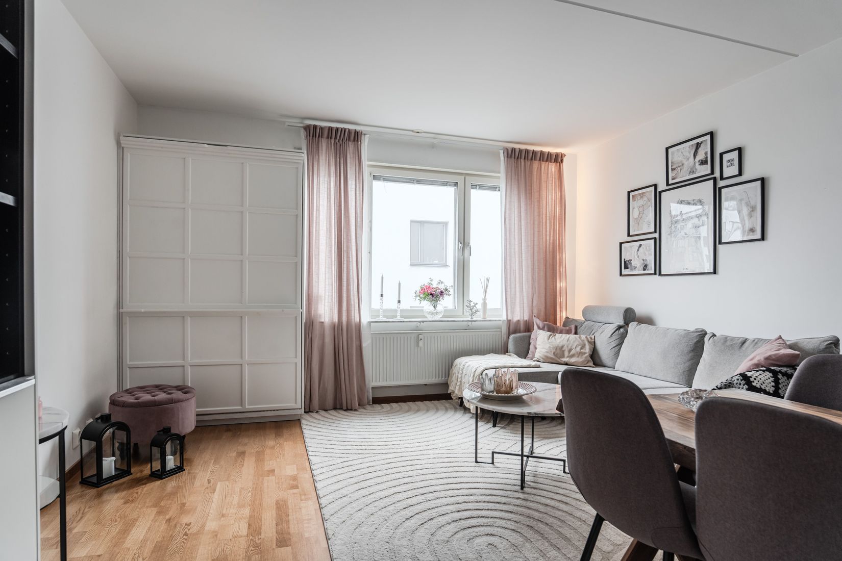 Interiören är genomgående ljus och fräsch, likaså får lägenheten generöst med ljusinsläpp från ett stort fönsterparti. Gediget parkettgolv kombineras med vita väggar och det finns även bra med utrymme för förvaring och garderober.
