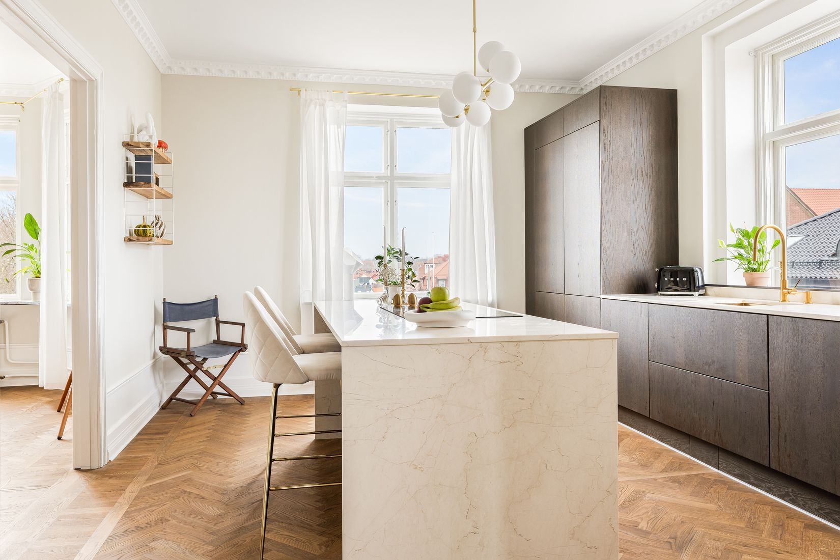 Vardagsrummet är något alldeles extra med burspråk och utsikt över stadens takåsar. Här flödar ljuset in vilket framhäver den vackra fiskbensparketten och den tidlösa färgpaletten. Rummet har gott om plats för både soffgrupp och läshörna och binds naturligt samman med köket.