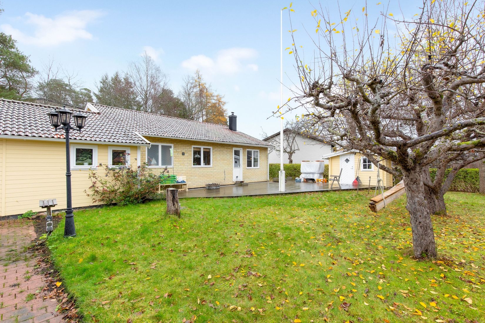 Det här trivsamma huset är byggt i tegel med en vacker, ljusgul fasad som omges av en grönskande trädgård. En stor trädäckad altan bjuder in till långa sommardagar och härliga kvällar med familj och vänner. Här finns gott om utrymme för både lek och avkoppling under bar himmel, och trädgården är en lugn oas där du kan njuta av årstidernas skiftningar på nära håll.