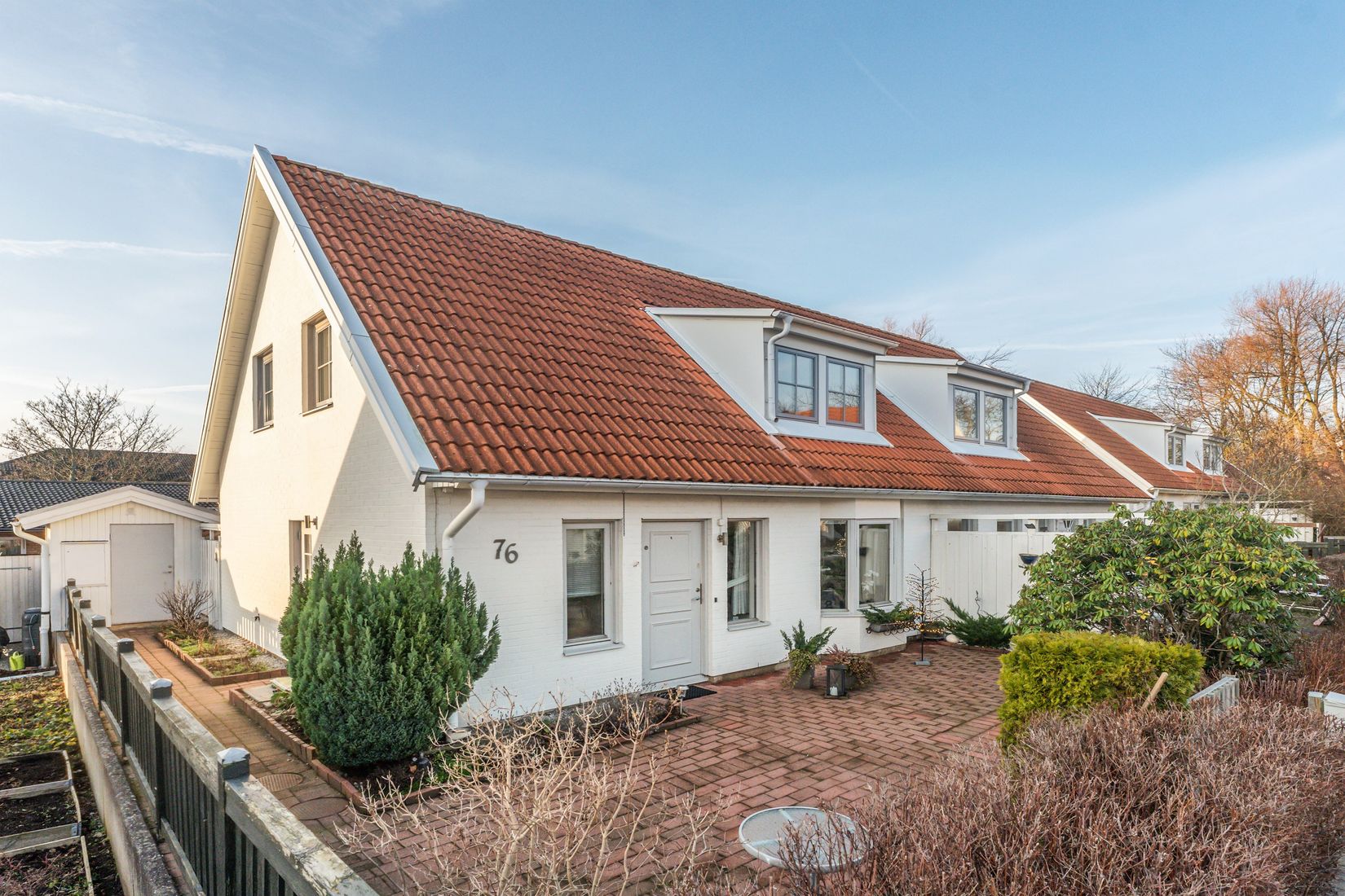 Redan vid ankomsten möts ni av den stenlagda framsidan som erbjuder gott om plats för utemöbler. På baksidan väntar ett privat och insynsskyddat uterum i generös storlek, inglasat och med plats för större möblemang. Här finns även ett praktiskt förråd samt ett trädäck som förlänger utesäsongen ytterligare och skapar en naturlig plats för sociala tillställningar.