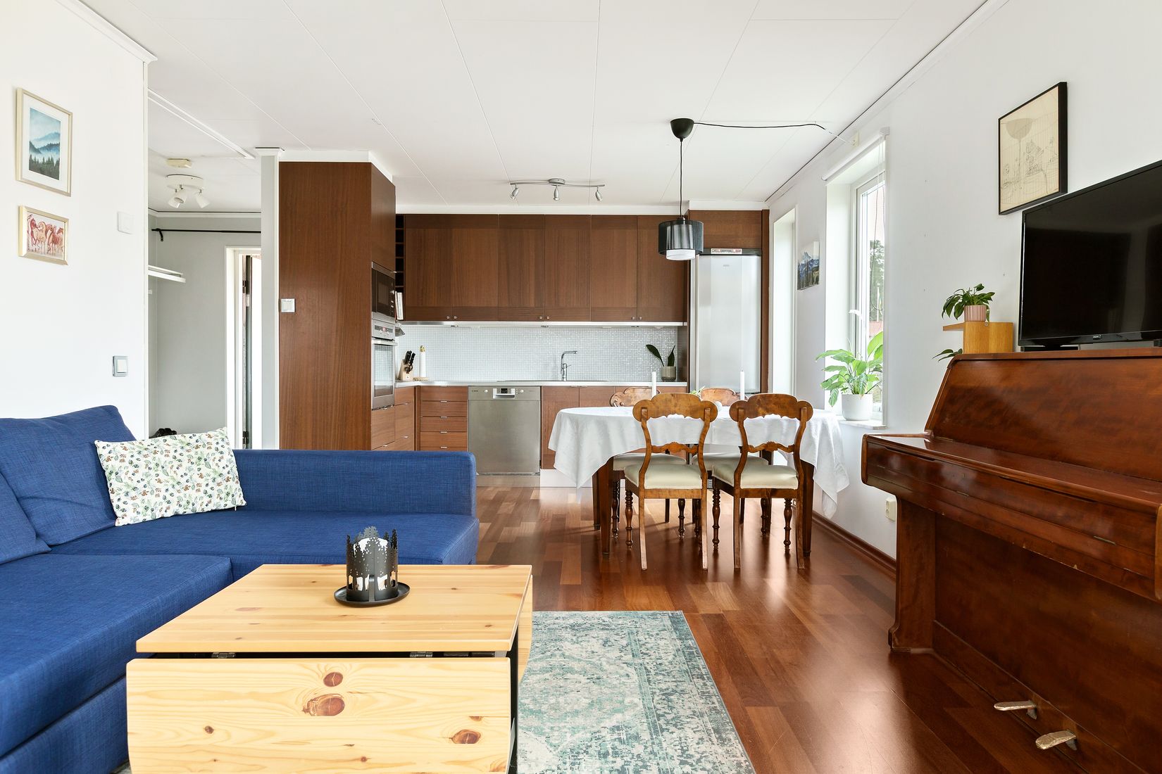 Redan i hallen möts du av en inbjudande känsla, med generösa ytor för både ytterkläder och praktisk förvaring. Härifrån leds du vidare in i hemmets sociala mittpunkt, köket och vardagsrummet som förenas i en öppen och lättsam planlösning. De stora fönsterpartierna och den charmiga franska balkongen låter ljuset flöda in och skapar en härligt luftig atmosfär.