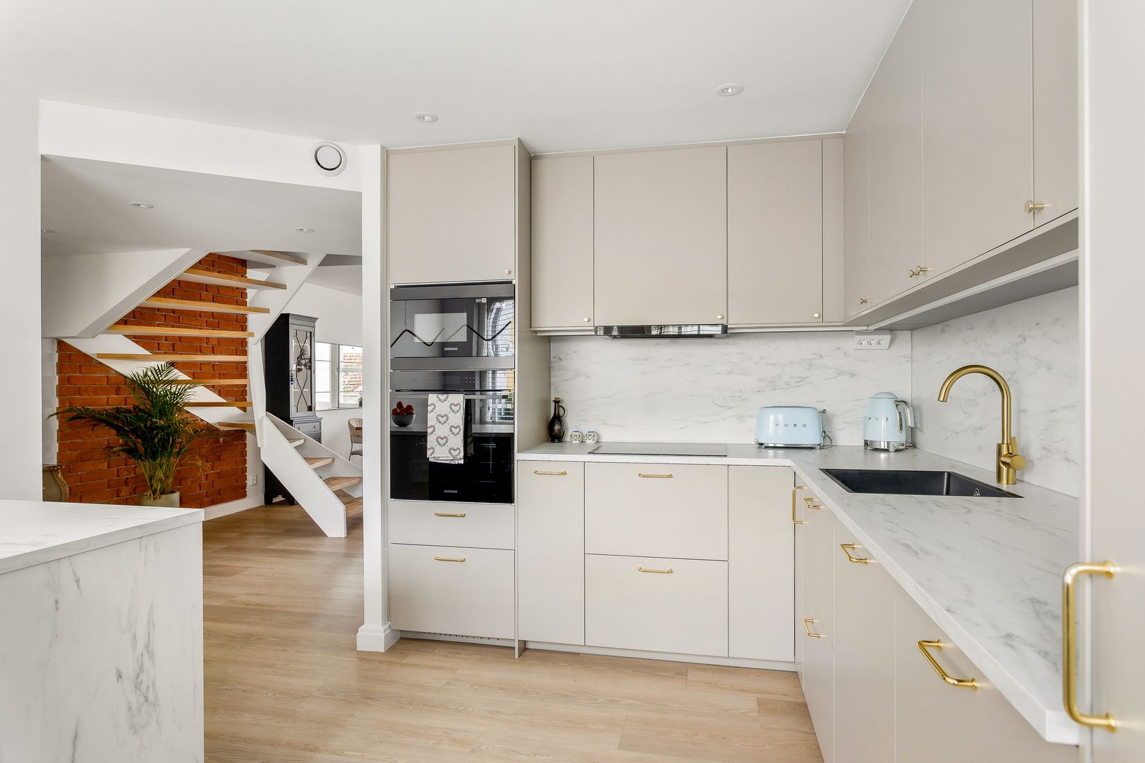Bostaden erbjuder ett supersnyggt, påkostat kök med eleganta ytmaterial, generösa arbetsytor och smarta förvaringslösningar – perfekt för både vardagsmatlagning och sociala tillställningar.