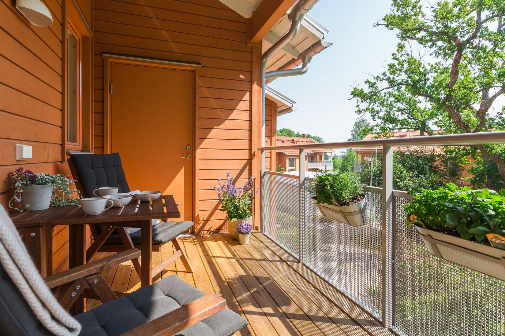 Från denna del når man även den stora balkongen belägen under tak som har plats för matgrupp, grill, solstolar och härliga blomsterarrangemang. Utsikten är ljuvlig mot allmänning.