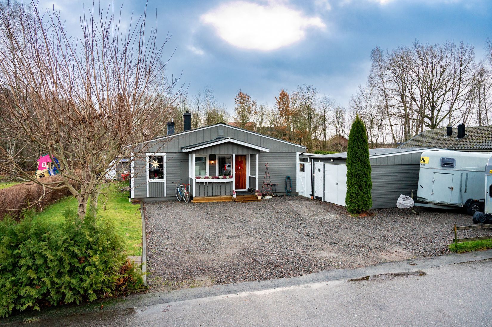På baksidan ligger det stora uterummet med kringliggande altan - perfekt för uteliv och samvaro vår till höst. I trädgården växer fruktträd som päron och plommon och plats finns även för lek och spel. Vid huset finns bra parkeringsmöjligheter både på grusad uppfart och i det fristående garaget. Vidbyggt garaget finns även ett redskapsförråd och i trädgården hittar man ytterligare ett förråd.