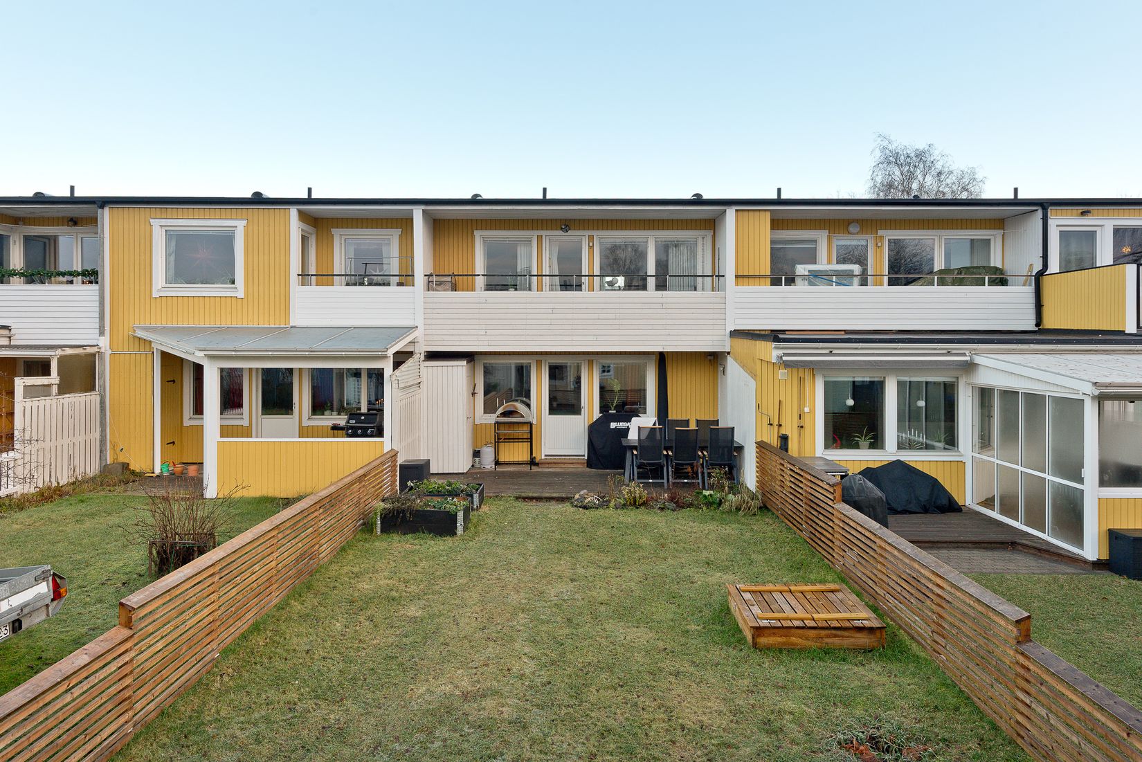 Från köket nås även baksidans härliga uteplats med nytt staket (2024), nyanlagd gräsmatta och ett soligt västläge som bjuder in till sommarkvällar, grillmiddagar och lek i trädgården.