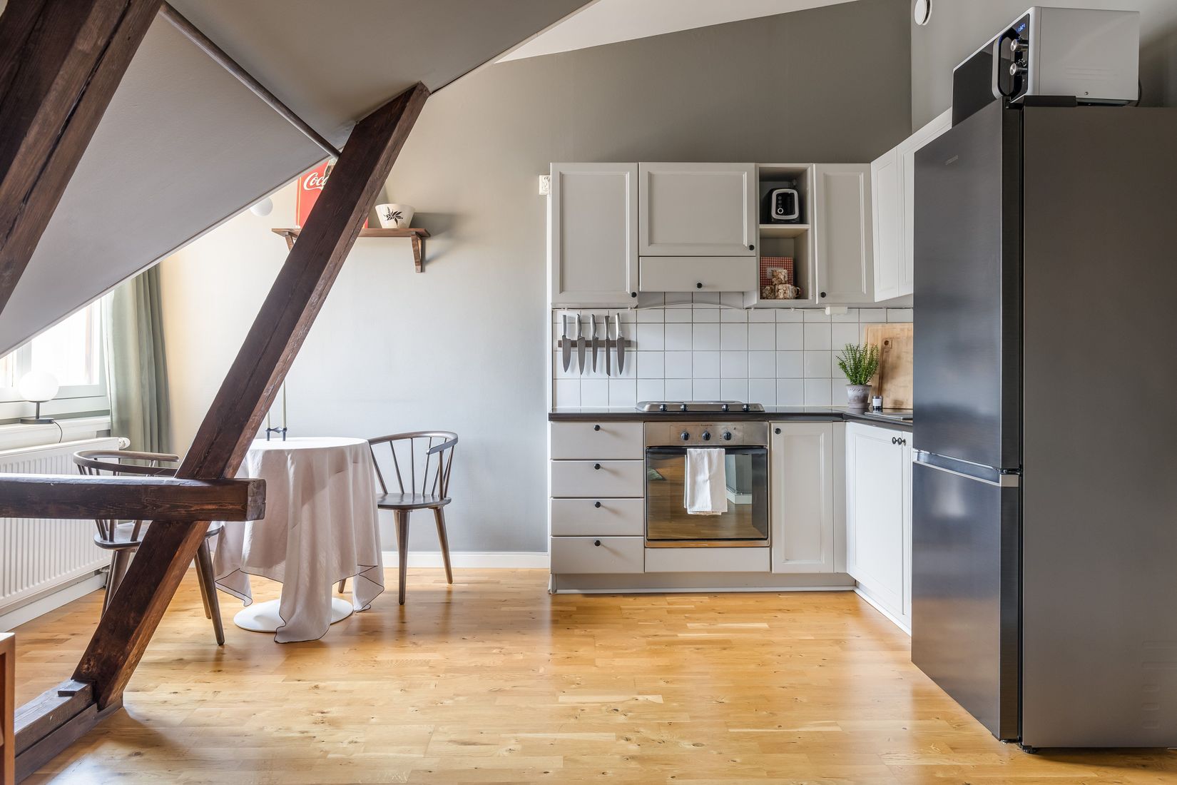 Detta är en unik vindslägenhet högst upp i huset – ett perfekt cityboende där charm, ljus och läge möts. Bostaden är registrerad som en enrummare men disponeras idag som en tvårummare om 45 kvm, med separat sovrum.